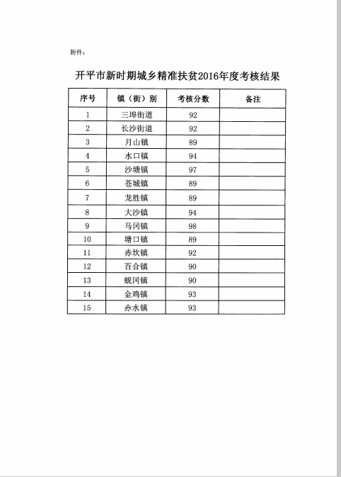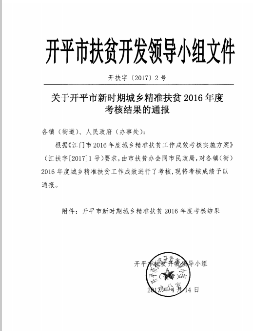 開扶字[2017]2號關于開平市新時期城鄉(xiāng)精準扶貧2016年度考核結果的通報