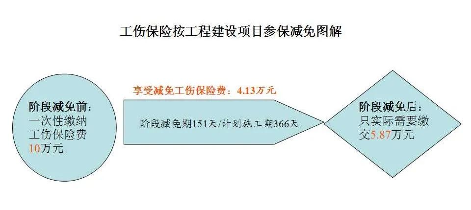 舉個例子:某建筑項目的施工總承包單位屬于中型企業(yè),該建筑工程項目從2020年2月1日計劃施工至2021年1月31日,按政策計算應(yīng)一次性繳納工傷保險費10萬元。由于其屬于減免期內(nèi)新開工建設(shè)項目,且施工總承包單位為中型企業(yè),可享受階段性免征工傷保險費政策,覆蓋的減免期為5個月共151天,則該項目可享受減免工傷保險費:4.13萬元=10萬元×(階段減免期151天/計劃施工期366天)×100%,即只實際需繳5.87萬元。