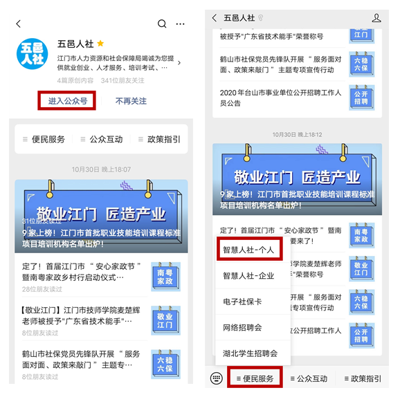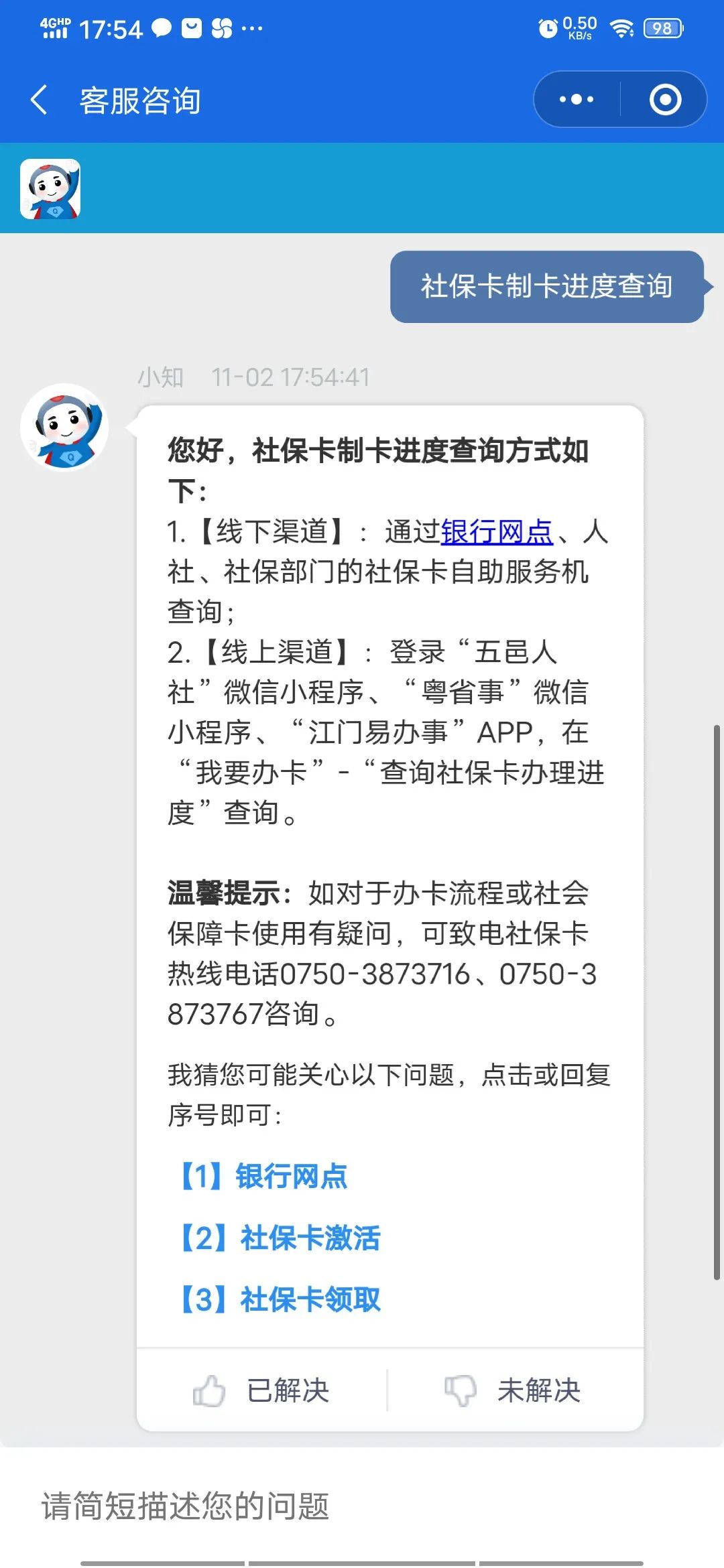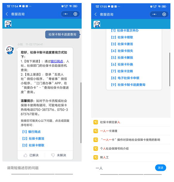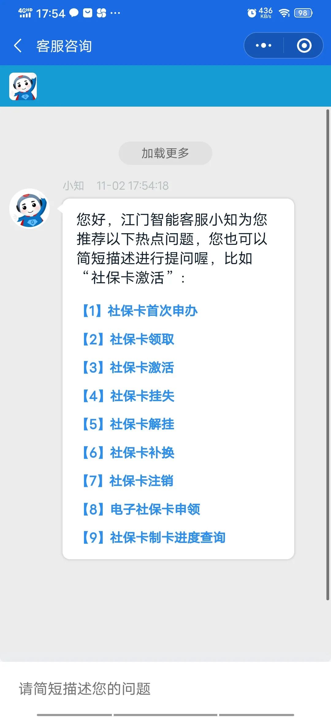 1.進入“五邑人社”微信公眾號,在“便民服務”菜單中選擇“智慧人社-個人” ,如下圖: 2 . 進 入 “五邑人社”小程序,點擊機器人圖標,如下圖,即可進入智能客服頁面: 1.藍色字體為便捷回復的目錄,點擊后,系統(tǒng)將自動發(fā)送對應問題的解答內容: 2.下面的輸入框可自定義輸入您想咨詢的問題,智能客服可以快速識別您的問題: 3.準確提供相關單位地址、業(yè)務辦理材料: