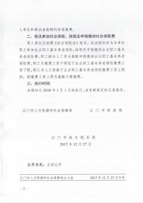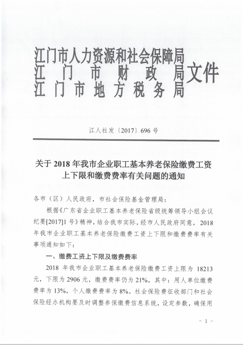 現(xiàn)將江門市人力資源和社會保障局、江門市財政局、江門市地方稅務(wù)局《關(guān)于2018年我市企業(yè)職工基本養(yǎng)老保險繳費工資上下限和繳費費率有關(guān)問題的通知》(江人社發(fā)〔2017〕696號)轉(zhuǎn)發(fā)給你們,請認(rèn)真貫徹執(zhí)行,并做好相關(guān)的宣傳解釋工作。