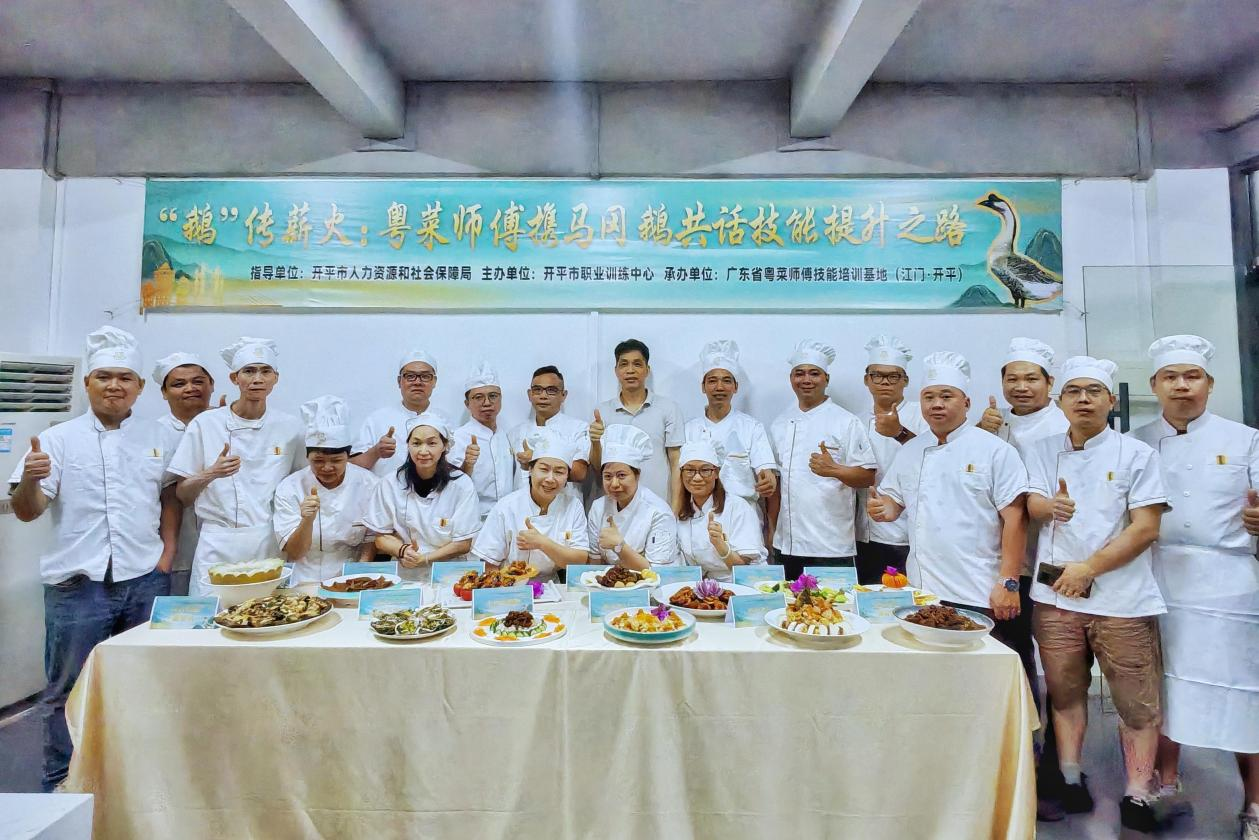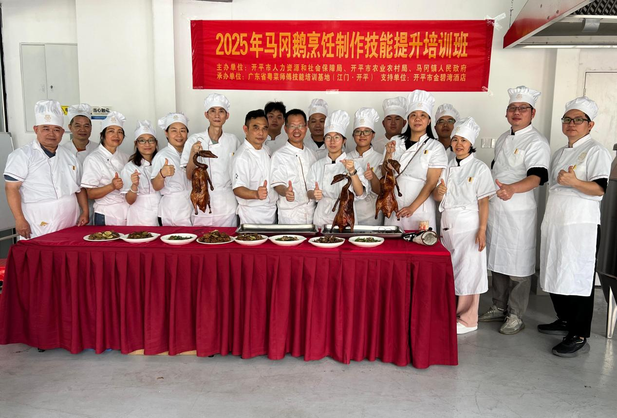 2025年5月,開(kāi)平市人社局聯(lián)合開(kāi)平市農(nóng)業(yè)農(nóng)村局、馬岡鎮(zhèn)人民政府縱深啟動(dòng)馬岡鵝烹飪技藝專項(xiàng)培訓(xùn),40余名學(xué)員在名廚師傅引領(lǐng)下精研脆皮水秘制工藝與“一鵝多味”味型創(chuàng)新,深入理解并融合經(jīng)典與當(dāng)代的味覺(jué)精髓。2021至今,開(kāi)平市人社局以粵菜技藝傳承為軸心,依托技能大師工作室及企業(yè)實(shí)訓(xùn)基地,整合社會(huì)資源創(chuàng)新培養(yǎng)模式,累計(jì)培養(yǎng)持證粵菜師傅超1000人,不僅為本地餐飲業(yè)持續(xù)輸送專業(yè)人才,有效促進(jìn)就業(yè),更向港澳地區(qū)輸送優(yōu)質(zhì)粵菜師傅,構(gòu)建并完善“本土深耕、灣區(qū)聯(lián)動(dòng)”的就業(yè)新生態(tài)。