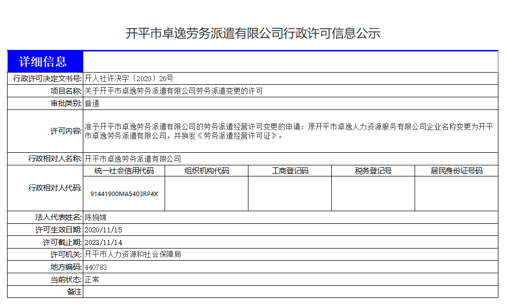 開平市卓逸勞務(wù)派遣有限公司行政許可信息公示
