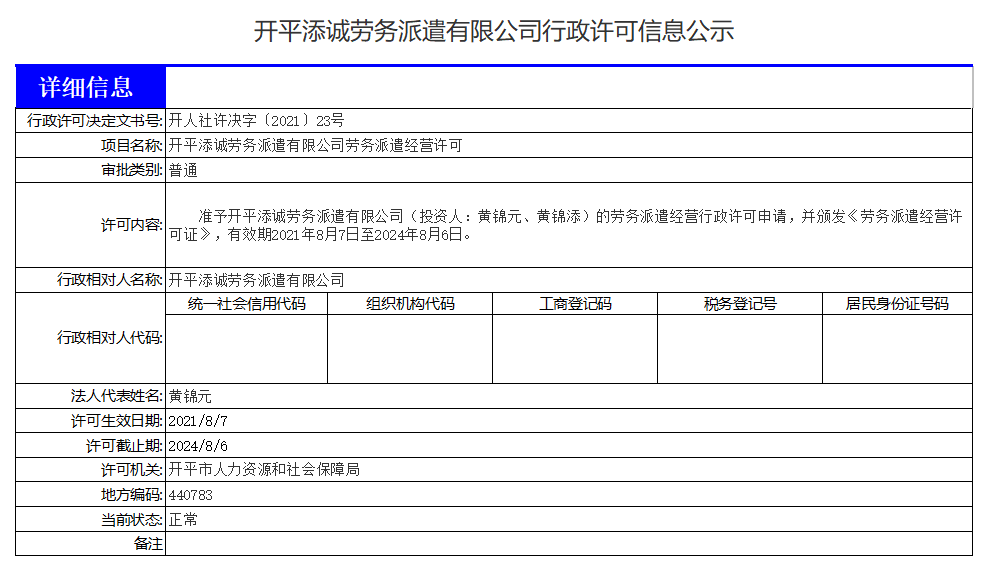 開平添誠(chéng)勞務(wù)派遣有限公司行政許可信息公示