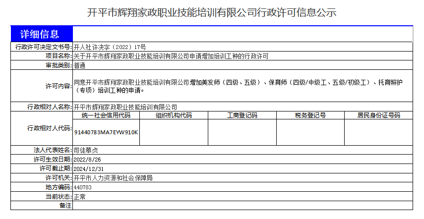 開(kāi)平市輝翔家政職業(yè)技能培訓(xùn)有限公司行政許可信息公示