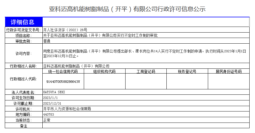 亞科邁高機(jī)能樹脂制品(開平)有限公司行政許可信息公示