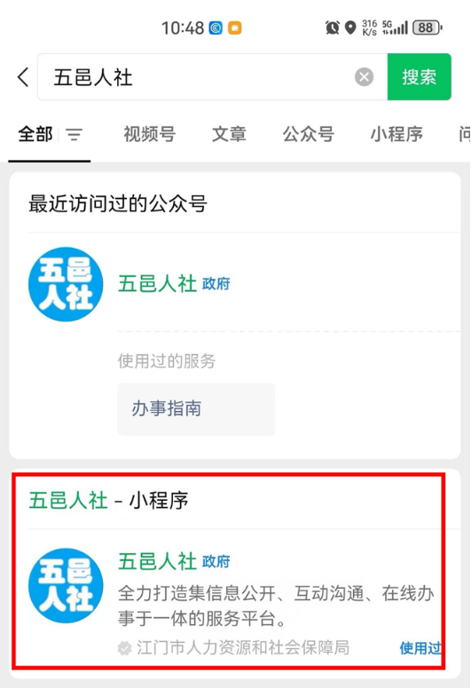 第一步:在微信搜索欄輸入“五邑人社”,點擊選擇“五邑人社”小程序。