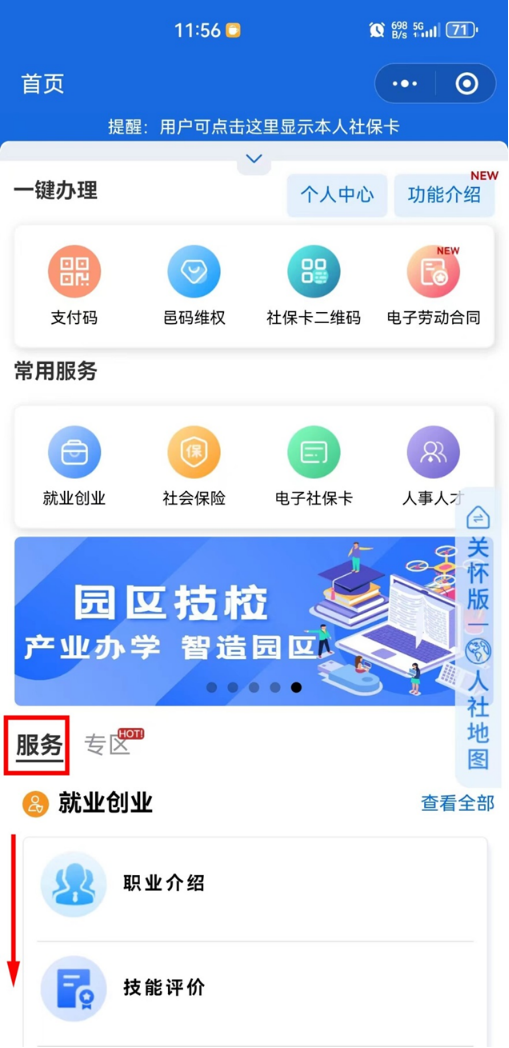第二步:進入“五邑人社”小程序初始界面,點選“服務”欄目,下拉頁面。