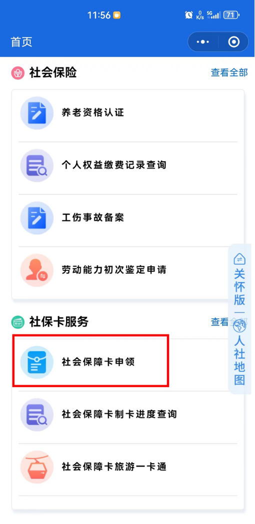 第三步:找到“社??ǚ铡睓谀?,點擊選擇“社會保障卡申領”選項。
