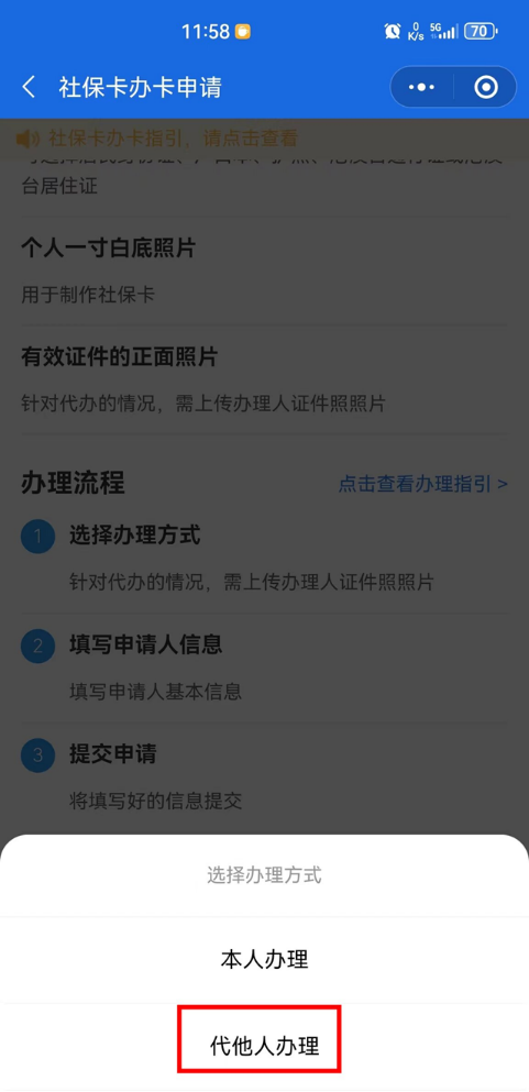 第五步:根據(jù)需求情況選擇辦理方式,如家長為學生申請辦卡的請選擇“代他人辦理”。