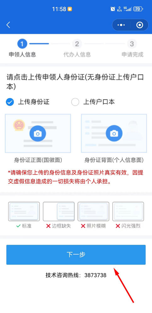 第六步:選擇辦理方式后,進入“辦理指南”界面,按提示準備好申領人及代辦人身份證或戶口本等相關證件照片、申領人個人一寸白底照片。