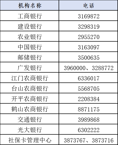 如有社保卡相關(guān)疑問,可致電江門社保卡管理中心或各社會保障卡合作銀行服務(wù)熱線咨詢: