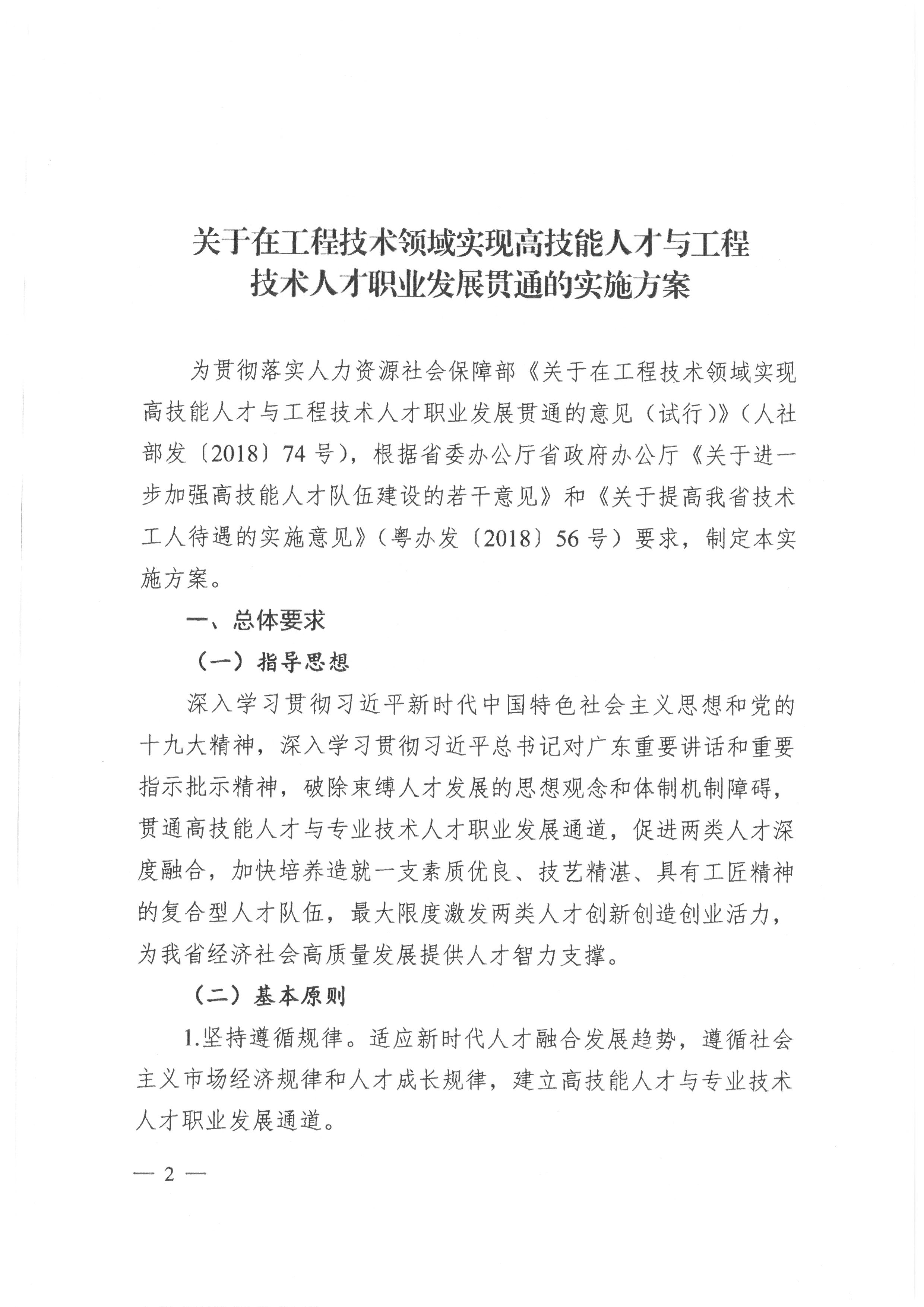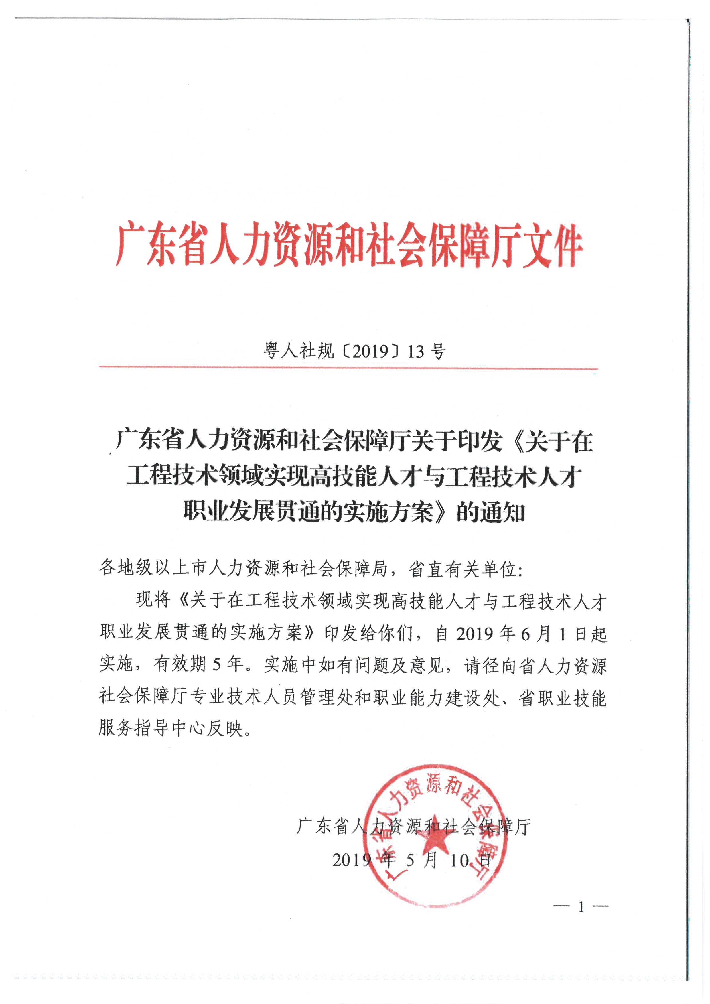 關(guān)于在工程技術(shù)領(lǐng)域?qū)崿F(xiàn)高技能人才與工程技術(shù)人才職業(yè)發(fā)展貫通的實(shí)施方案(粵人社規(guī)[2019] 13號(hào))