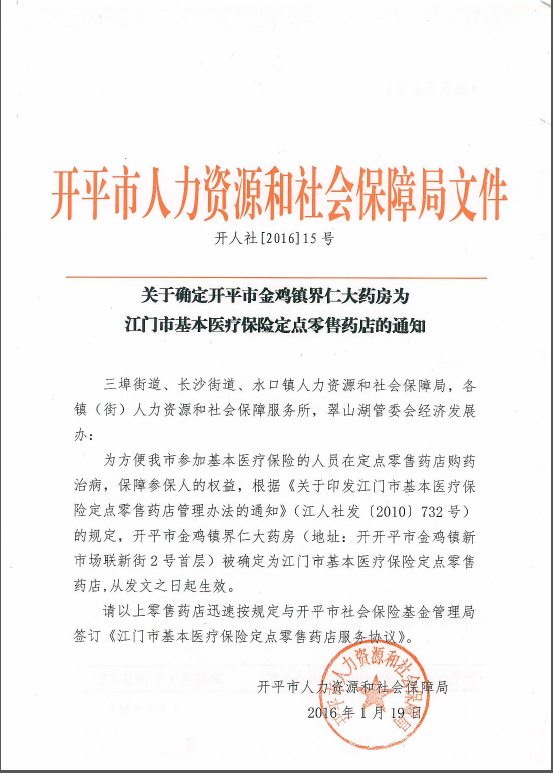 關(guān)于確定開平市金雞鎮(zhèn)界仁大藥房為江門市基本醫(yī)療保險定點零售藥店的通知