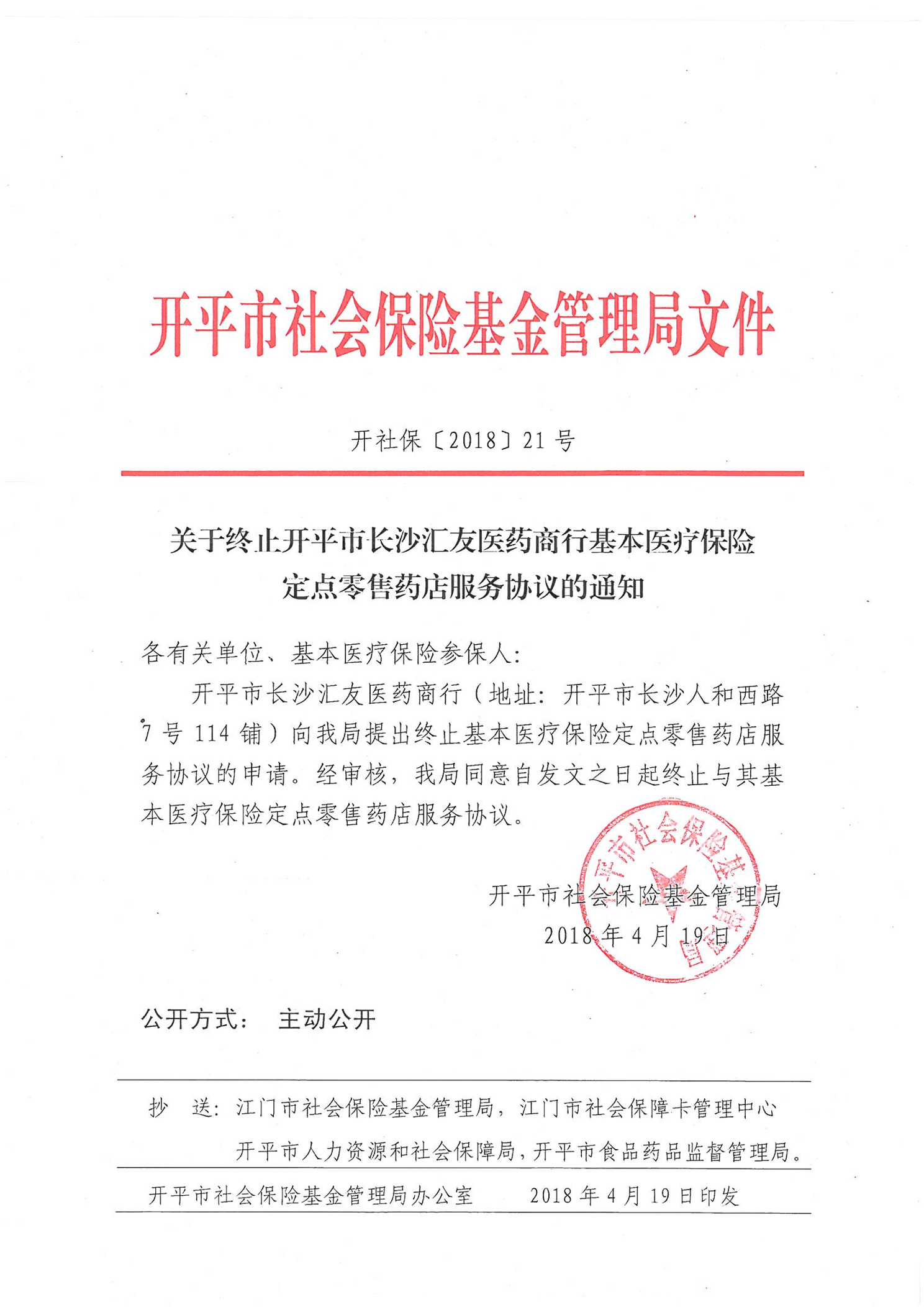 關(guān)于終止開平市長沙匯友醫(yī)藥商行基本醫(yī)療保險定點零售藥店服務協(xié)議的通知