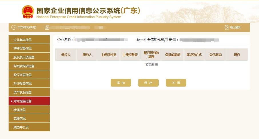 第12步:進(jìn)入對(duì)外擔(dān)保信息頁(yè)面。點(diǎn)擊“添加”,填寫對(duì)外擔(dān)保信息。填寫完點(diǎn)擊“保存”,進(jìn)入對(duì)外擔(dān)保信息基本頁(yè)面,再點(diǎn)擊“保存”??商砑佣鄺l對(duì)外擔(dān)保信息,也可修改或刪除信息。沒(méi)有相關(guān)信息的直接點(diǎn)擊保存。