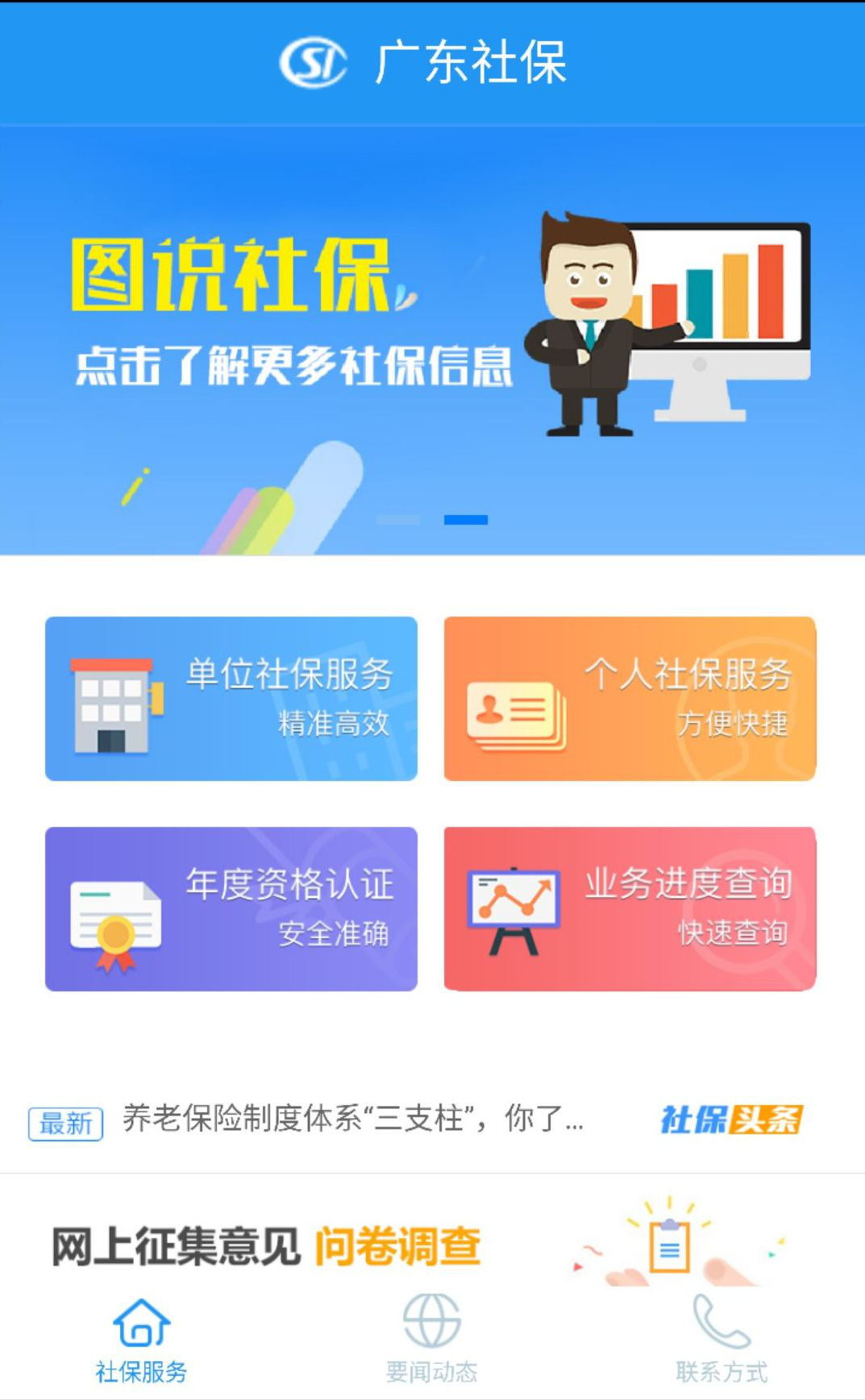 1.掃描二維碼下載“廣東社?!笔謾C(jī)APP,打開APP,在社保服務(wù)欄目?jī)?nèi), 點(diǎn)擊“個(gè)人年度資格認(rèn)證” 按鈕, 進(jìn)入服務(wù)界面。