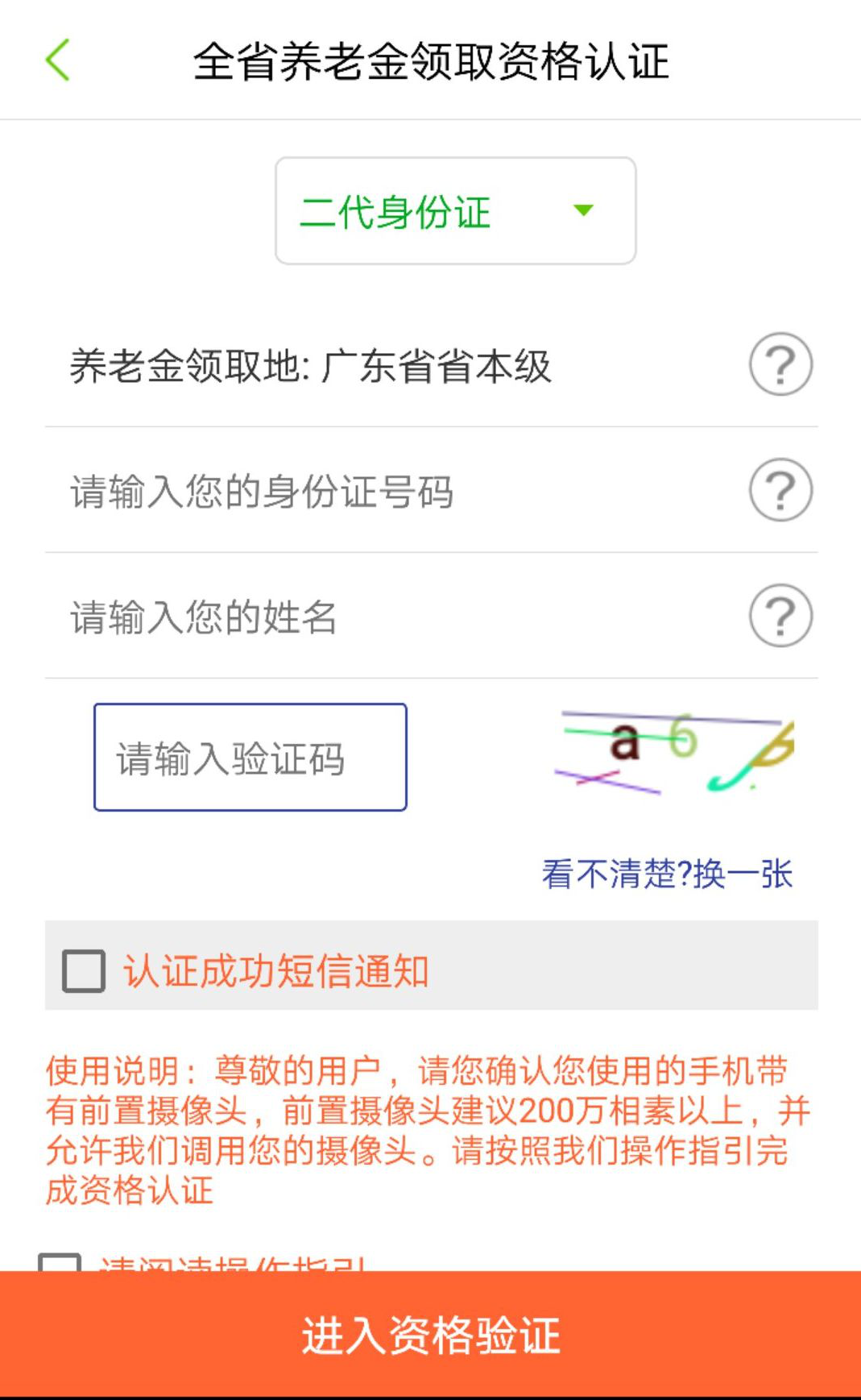 2.選擇養(yǎng)老金領(lǐng)取地,輸入二代身份證號(hào)碼,姓名,驗(yàn)證碼信息,閱讀操作指引,閱讀清楚后勾選確認(rèn),點(diǎn)擊“進(jìn)入資格認(rèn)證” 按鈕。如認(rèn)證成功需要短信通知,請(qǐng)選擇并填入手機(jī)號(hào)碼。