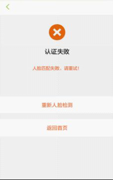 4.如果人臉檢測(cè)失敗,可點(diǎn)擊重新人臉檢測(cè)按鈕,重新檢測(cè);如果人臉匹配失敗,可重新檢測(cè)亦可點(diǎn)擊重新人臉檢測(cè)按鈕,如需返回首頁(yè),可點(diǎn)擊返回首頁(yè)按鈕。