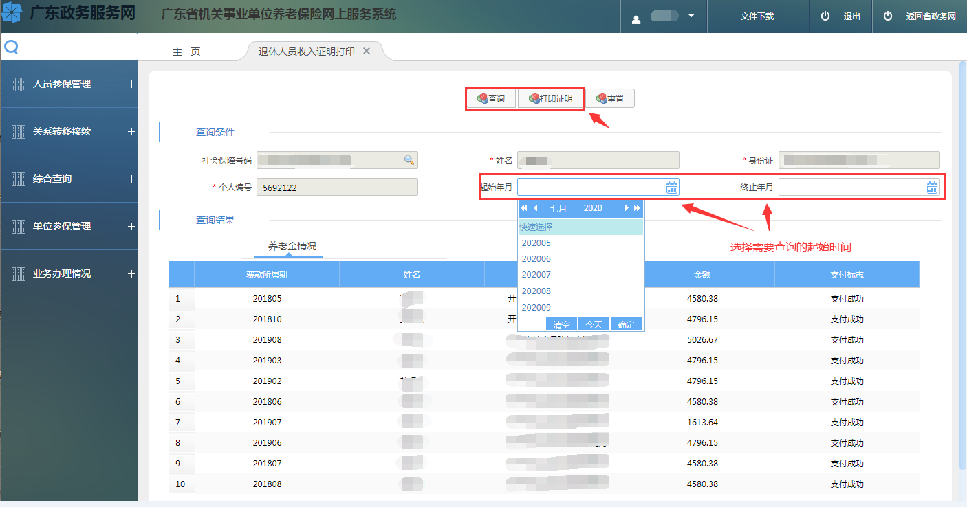 查詢打印路徑:綜合查詢→退休人員收入證明打印→社保號查詢→輸入起始和終止年月→導(dǎo)出打印