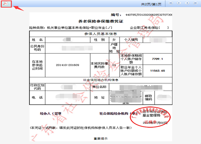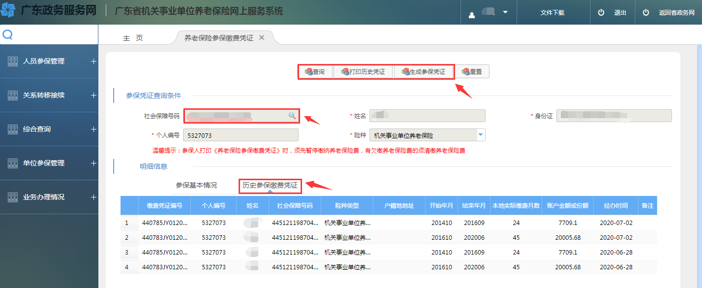 打印路徑:關(guān)系轉(zhuǎn)移接續(xù)→養(yǎng)老保險參保繳費(fèi)憑證→社保號查詢→打印歷史憑證→生成參保憑證
