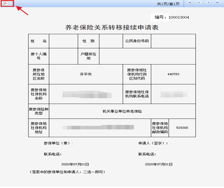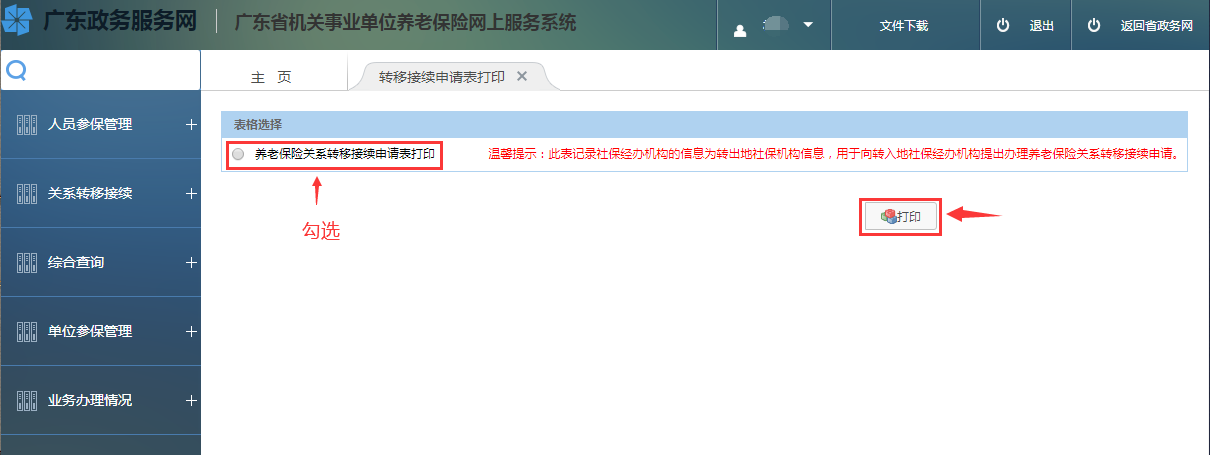 打印路徑:關(guān)系轉(zhuǎn)移接續(xù)→轉(zhuǎn)移接續(xù)申請表打印→勾選養(yǎng)老保險關(guān)系轉(zhuǎn)移接續(xù)申請表打印→打印
