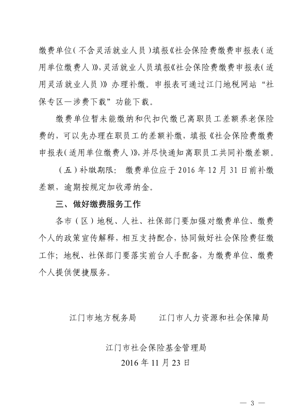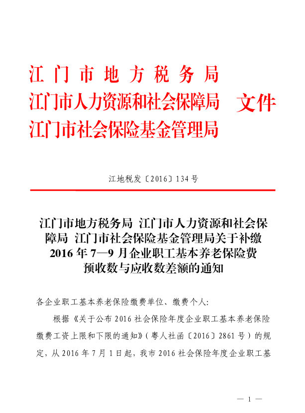 江門市地方稅務(wù)局 江門市人力資源和社會(huì)保障局 江門市社會(huì)保險(xiǎn)基金管理局關(guān)于補(bǔ)繳2016年7-9月企業(yè)職工基本養(yǎng)老保險(xiǎn)費(fèi)預(yù)收數(shù)與應(yīng)收數(shù)差額的通知
