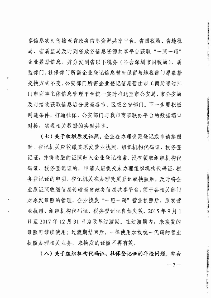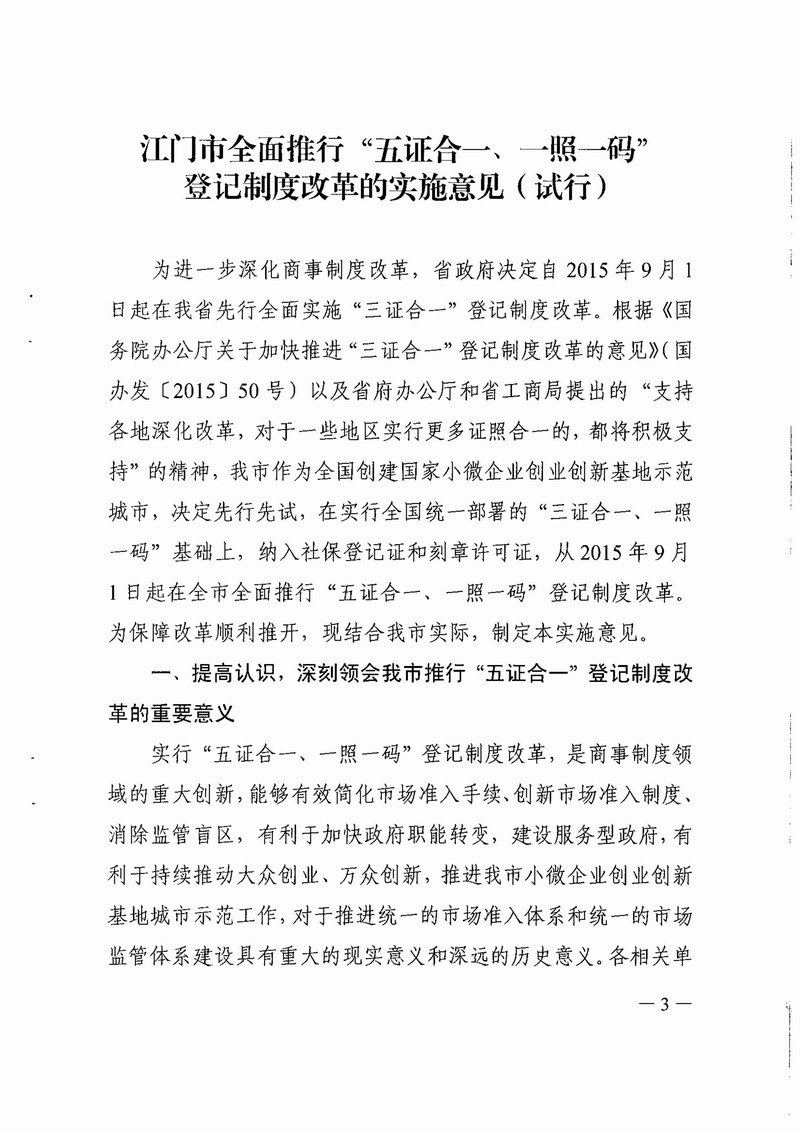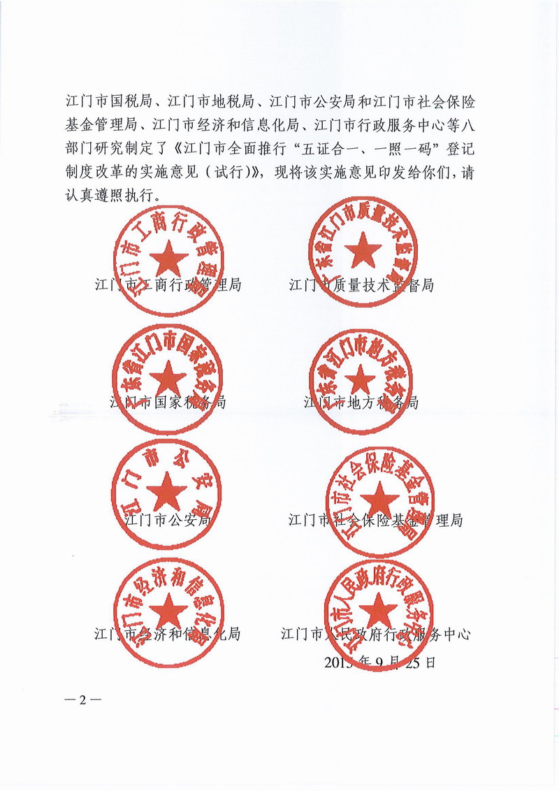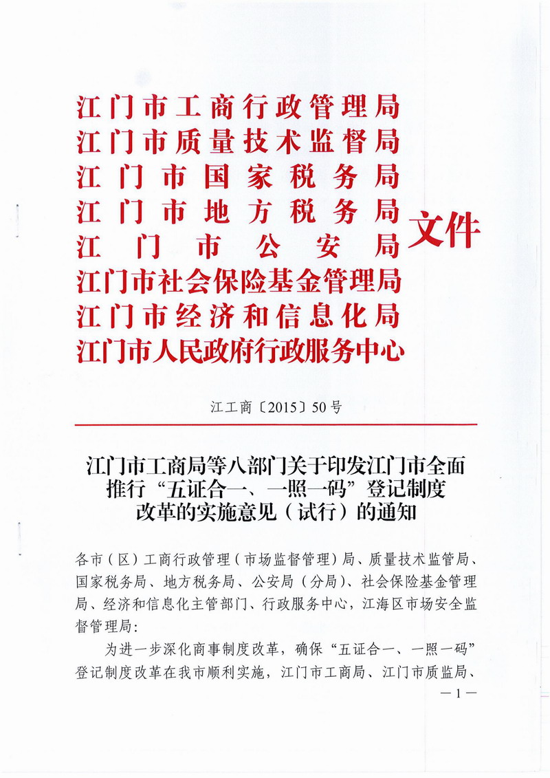 江門市工商局等八部門關(guān)于印發(fā)江門市全面推行“五證合一、一照一碼”登記制度改革的實施意見(試行)的通知