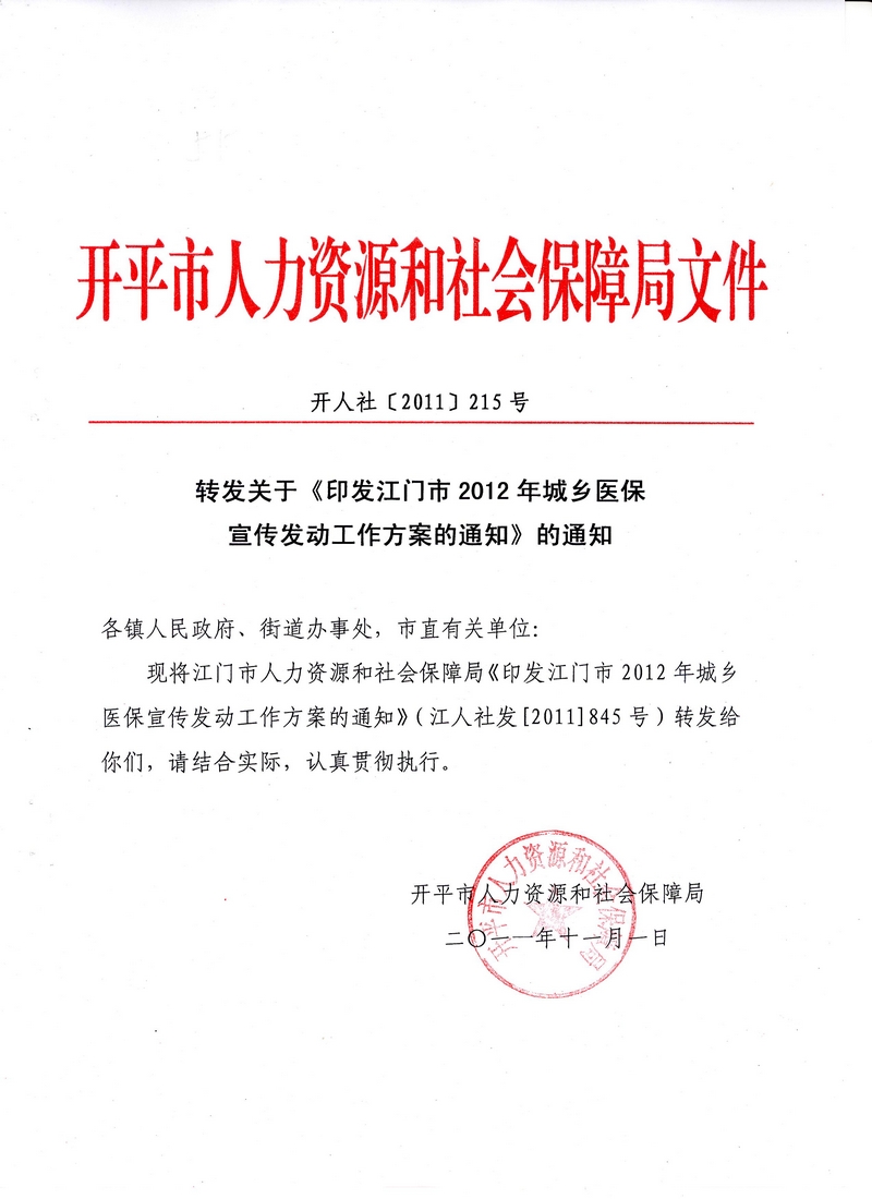 轉(zhuǎn)發(fā)關(guān)于《印發(fā)江門市2012年城鄉(xiāng)醫(yī)保宣傳發(fā)動(dòng)工作方案的通知》的通知