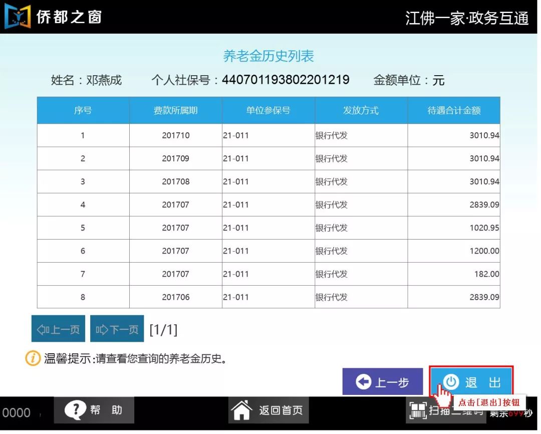 ---在【養(yǎng)老金歷史列表】頁面,查看養(yǎng)老金歷史信息,可點擊【退出】按鈕返回首頁