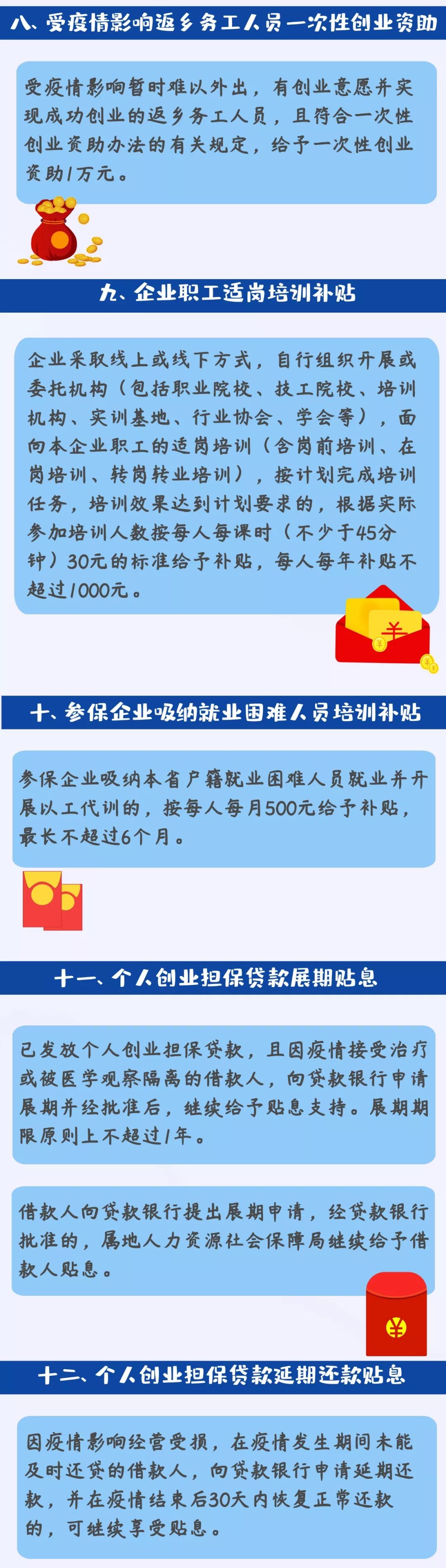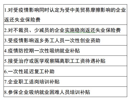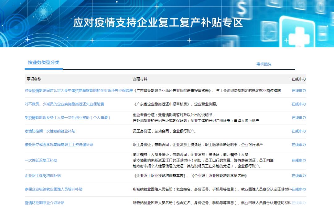 截至目前,已開通網(wǎng)上申請的復工復產(chǎn)相關補貼共8項,詳細補貼清單如下: