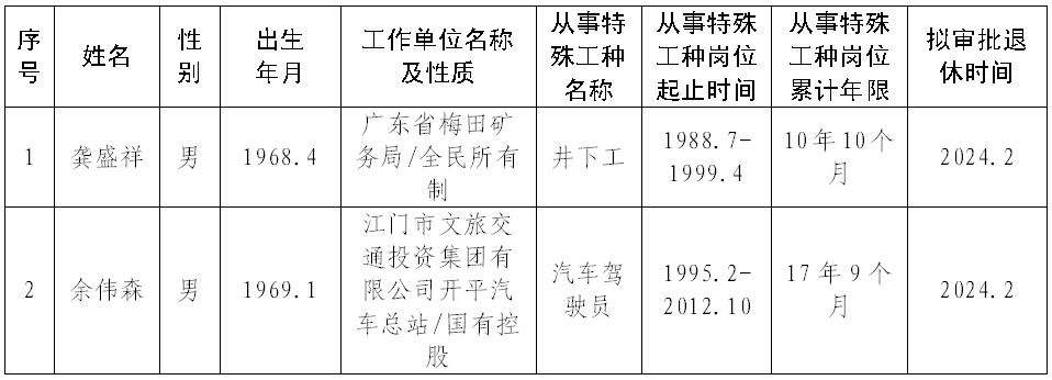 根據(jù)《關(guān)于規(guī)范特殊工種提前退休審批工作有關(guān)問題的通知》(粵勞社〔2002〕136號)、《轉(zhuǎn)發(fā)人力資源社會保障部關(guān)于進一步加強企業(yè)特殊工種提前退休管理工作的通知》(粵人社函〔2018〕4037號)的有關(guān)規(guī)定,經(jīng)初步審核,龔盛祥等2人符合特殊工種提前退休條件,擬同意辦理提前退休手續(xù),現(xiàn)將有關(guān)情況予以公示(見附表)。