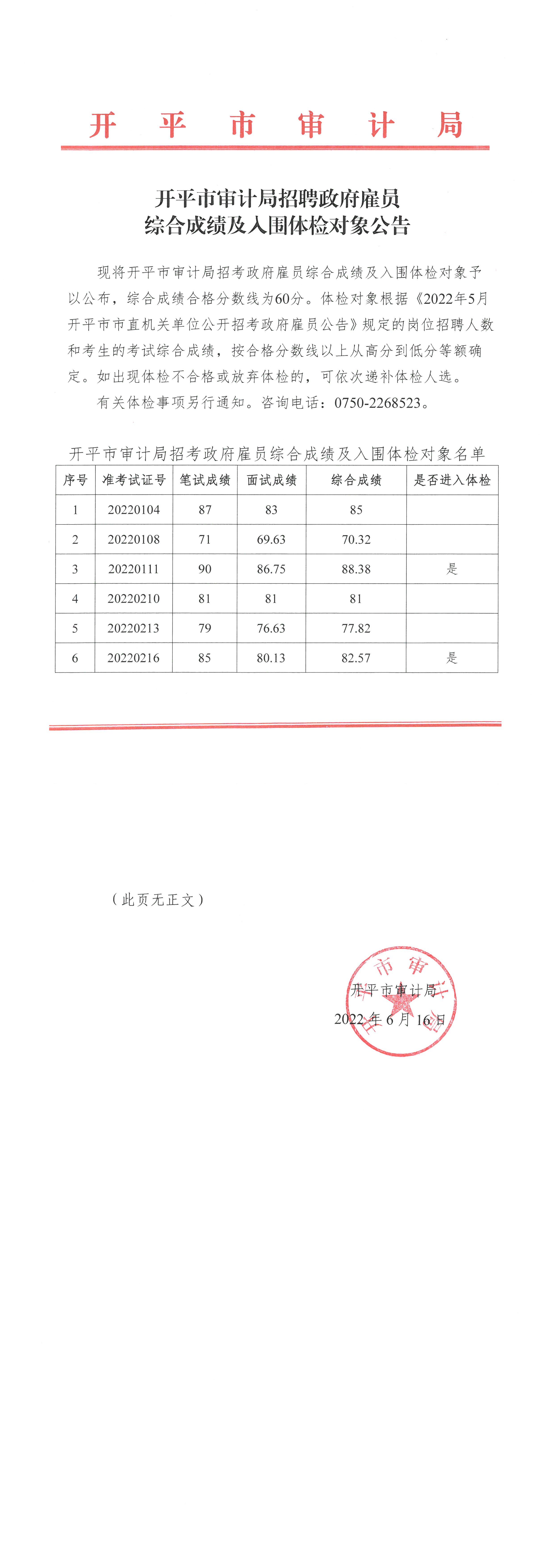 開平市審計局招聘政府雇員綜合成績及入圍體檢對象公告