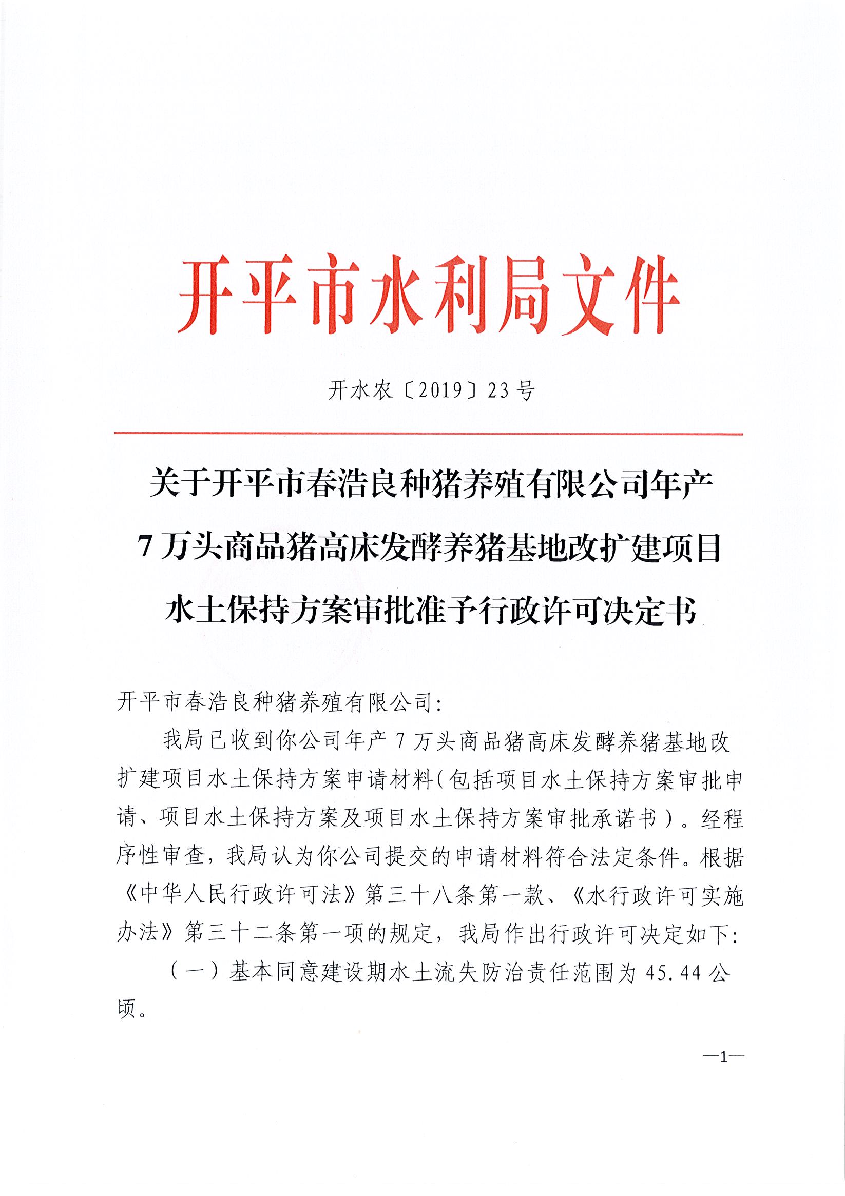 關(guān)于開平市春浩良種豬養(yǎng)殖有限公司年產(chǎn)7萬頭商品豬高床發(fā)酵養(yǎng)豬基地改擴建項目水土保持方案審批準(zhǔn)予行政許可決定書