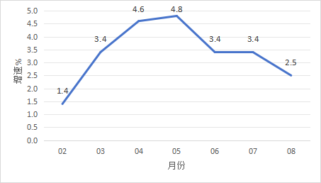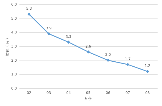 1-8月,全市主要經(jīng)濟(jì)指標(biāo)運(yùn)行簡況如下: 一、工業(yè)生產(chǎn) 1-8月,開平規(guī)模以上工業(yè)企業(yè)累計(jì)完成工業(yè)增加值85.41億元,同比增長2.5%。 分經(jīng)濟(jì)類型看,股份制企業(yè)增長4.8%;外商及港澳臺商投資企業(yè)下降1.4%;私營企業(yè)下降2.3%。分門類看,采礦業(yè)增加值下降24.1%,制造業(yè)增加值增長1.2%,電力、熱力、燃?xì)饧八a(chǎn)和供應(yīng)業(yè)增加值增長105.7%。 圖一 2024年2月以來開平市規(guī)模以上工業(yè)增加值增速 二、投資 1-8月,全市完成固定資產(chǎn)投資同比增長3.0%。分經(jīng)濟(jì)類型看,國有投資下降20.8%,民間投資下降3.1%。分產(chǎn)業(yè)看,第一產(chǎn)業(yè)投資下降47.5%;第二產(chǎn)業(yè)投資增長4.8%,其中工業(yè)投資增長4.8%;第三產(chǎn)業(yè)投資增長2.2%,其中房地產(chǎn)投資下降13.7%。 三、消費(fèi)市場 1-8月,我市完成社會消費(fèi)品零售總額121.74億元,同比增長1.2%。 圖二 2024年2月以來開平市社會消費(fèi)品零售總額增速 四、財(cái)政收入 1-8月,全市實(shí)現(xiàn)地方一般公共預(yù)算收入17.96億元,同比增長4.1%,其中稅收收入9.69億元,同比下降7.3%。 五、金融市場 8月末,全市金融機(jī)構(gòu)本外幣各項(xiàng)存款余額955.77億元,同比增長6.3%;本外幣各項(xiàng)貸款余額699.49億元,同比增長8.1%。 六、外貿(mào)進(jìn)出口 1-8月,全市外貿(mào)進(jìn)出口總額108.6億元,同比增長8.7%。其中,進(jìn)口9.9億元,同比增長21.4%;出口98.7億元,同比增長7.6%。