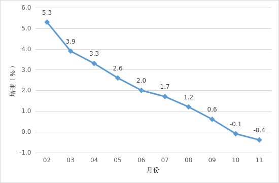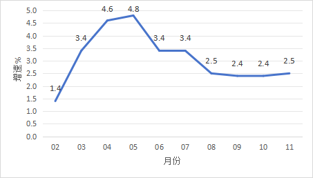 1-11月,全市主要經(jīng)濟指標運行簡況如下: 一、工業(yè)生產(chǎn) 1-11月,開平規(guī)模以上工業(yè)企業(yè)累計完成工業(yè)增加值119.82億元,同比增長2.5%。 分經(jīng)濟類型看,股份制企業(yè)增長8.0%;外商及港澳臺商投資企業(yè)下降2.3%;私營企業(yè)增長3.7%。分門類看,采礦業(yè)增加值下降28.0%,制造業(yè)增加值增長1.5%,電力、熱力、燃氣及水生產(chǎn)和供應(yīng)業(yè)增加值增長77.2%。 圖一 2024年2月以來開平市規(guī)模以上工業(yè)增加值增速 二、投資 1-11月,全市完成固定資產(chǎn)投資同比增長1.5%。分經(jīng)濟類型看,國有投資下降23.0%,民間投資下降2.8%。分產(chǎn)業(yè)看,第一產(chǎn)業(yè)投資下降57.9%;第二產(chǎn)業(yè)投資增長2.2%,其中工業(yè)投資增長2.2%;第三產(chǎn)業(yè)投資增長3.7%,其中房地產(chǎn)投資下降11.3%。 三、消費市場 1-11月,我市完成社會消費品零售總額171.55億元,同比下降0.4%。 圖二 2024年2月以來開平市社會消費品零售總額增速 四、財政收入 1-11月,全市實現(xiàn)地方一般公共預算收入26.95億元,同比下降1.1%,其中稅收收入14.01億元,同比下降7.1%。 五、金融市場 11月末,全市金融機構(gòu)本外幣各項存款余額1009.31億元,同比增長9.4%;本外幣各項貸款余額720.44億元,同比增長8.6%。 六、外貿(mào)進出口 1-11月,全市外貿(mào)進出口總額148.9億元,同比增長7.3%。其中,進口13.9億元,同比增長19.1%;出口135.0億元,同比增長6.2%。
