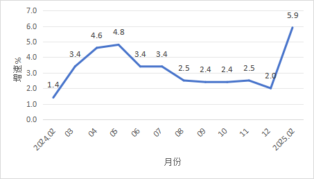 1-2月,全市主要經(jīng)濟(jì)指標(biāo)運行簡況如下: 一、工業(yè)生產(chǎn) 1-2月,開平規(guī)模以上工業(yè)企業(yè)累計完成工業(yè)增加值17.17億元,同比增長5.9%。 分經(jīng)濟(jì)類型看,股份制企業(yè)增長4.5%;外商及港澳臺商投資企業(yè)增長8.8%;私營企業(yè)下降0.2%。分門類看,采礦業(yè)增加值下降2.9%,制造業(yè)增加值增長5.7%,電力、熱力、燃?xì)饧八a(chǎn)和供應(yīng)業(yè)增加值增長12.4%。 1-2月全市工業(yè)用電量增長4.2%。 圖一 2024年2月以來開平市規(guī)模以上工業(yè)增加值增速 二、投資 1-2月,全市完成固定資產(chǎn)投資同比下降27.5%。分經(jīng)濟(jì)類型看,國有投資下降35.2%;民間投資下降18.3%。 三、消費市場 1-2月,我市完成社會消費品零售總額28.55億元,同比下降0.7%。 圖二 2024年2月以來開平市社會消費品零售總額增速 四、財政收入 1-2月,全市實現(xiàn)地方一般公共預(yù)算收入5.38億元,同比增長1.1%,其中稅收收入3.00億元,同比下降7.1%。 五、金融市場 2月末,全市金融機(jī)構(gòu)本外幣各項存款余額1042.86億元,同比增長9.6%;本外幣各項貸款余額728.81億元,同比增長4.8%。 六、外貿(mào)進(jìn)出口 1-2月,全市外貿(mào)進(jìn)出口總額25.2億元,同比增長2.1%。其中,進(jìn)口1.8億元,同比下降10.6%;出口23.4億元,同比增長3.3%。