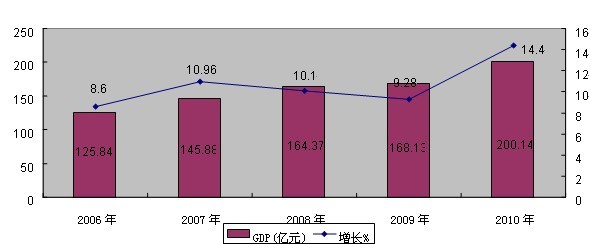 2010年,全市國民經(jīng)濟(jì)繼續(xù)保持健康發(fā)展,經(jīng)濟(jì)增長速度適度加快,經(jīng)濟(jì)運(yùn)行質(zhì)量明顯提高。初步核算全年實(shí)現(xiàn)生產(chǎn)總值200.14億元(當(dāng)年價(jià)),比上年增長14.4%。其中:第一產(chǎn)業(yè)增加值20.09億元,增長4.2%;第二產(chǎn)業(yè)增加值103.66億元,增長20.5 %;第三產(chǎn)業(yè)增加值76.39億元,增長9.0%。第一、二、三產(chǎn)業(yè)增加值的比重為10.0 : 51.8 : 38.2。按戶籍人口計(jì)人均生產(chǎn)總值29105元。
