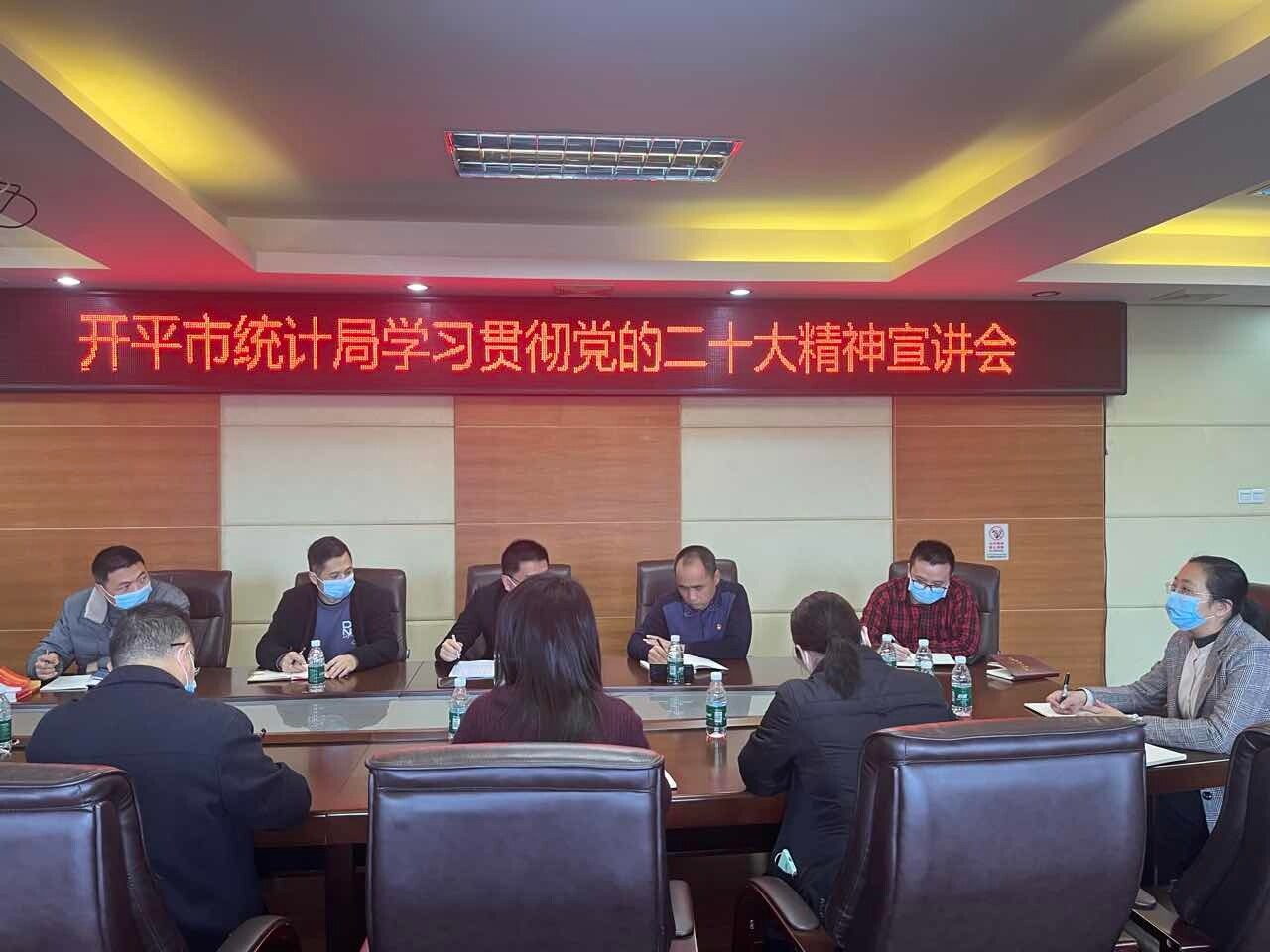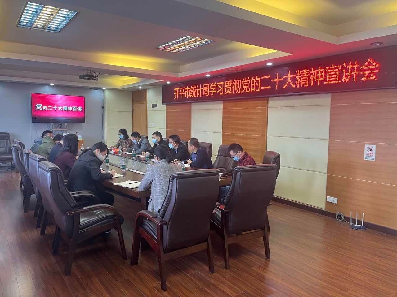 開平市統(tǒng)計局召開學(xué)習(xí)貫徹黨的二十大精神宣講會 為深入推進(jìn)黨的二十大精神的學(xué)習(xí),進(jìn)一步落實全面從嚴(yán)治黨要求,2月1日開平市統(tǒng)計局召開學(xué)習(xí)貫徹黨的二十大精神宣講會,局全體黨員參加。 宣講會首先以視頻方式組織收看了國家統(tǒng)計局“全面從嚴(yán)治黨”專題講座,中央紀(jì)委國家監(jiān)委駐委紀(jì)檢監(jiān)察組二級巡視員劉桂紅作了專題輔導(dǎo)。隨后黨組書記、局長李健鵬同志主持集體學(xué)習(xí)。與會班子成員圍繞黨的二十大提出的新目標(biāo)、新方略、新任務(wù)、新舉措,立足統(tǒng)計部門職能,就如何提高統(tǒng)計數(shù)據(jù)質(zhì)量、強(qiáng)化經(jīng)濟(jì)形勢分析研判、扎實做好各項統(tǒng)計調(diào)查和提高優(yōu)質(zhì)統(tǒng)計服務(wù)等內(nèi)容進(jìn)行了交流發(fā)言。 通過宣講學(xué)習(xí),全體黨員進(jìn)一步加深了對習(xí)近平新時代中國特色社會主義思想和黨的二十大精神的理解和把握,明確了新一年的工作目標(biāo),達(dá)到了相互啟發(fā),促進(jìn)落實的目標(biāo)。