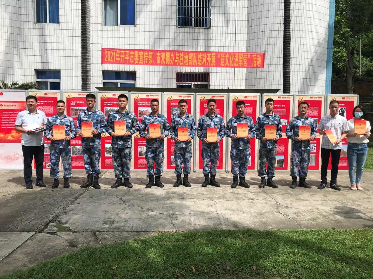 為進一步激發(fā)駐地部隊官兵們的愛黨愛國熱情,落實軍地“雙清單”,8月19日,市委宣傳部聯(lián)合市雙擁辦開展送黨史文化進駐開平海軍部隊活動,并為全體官兵送上《中華人民共和國退役軍人保障法》。