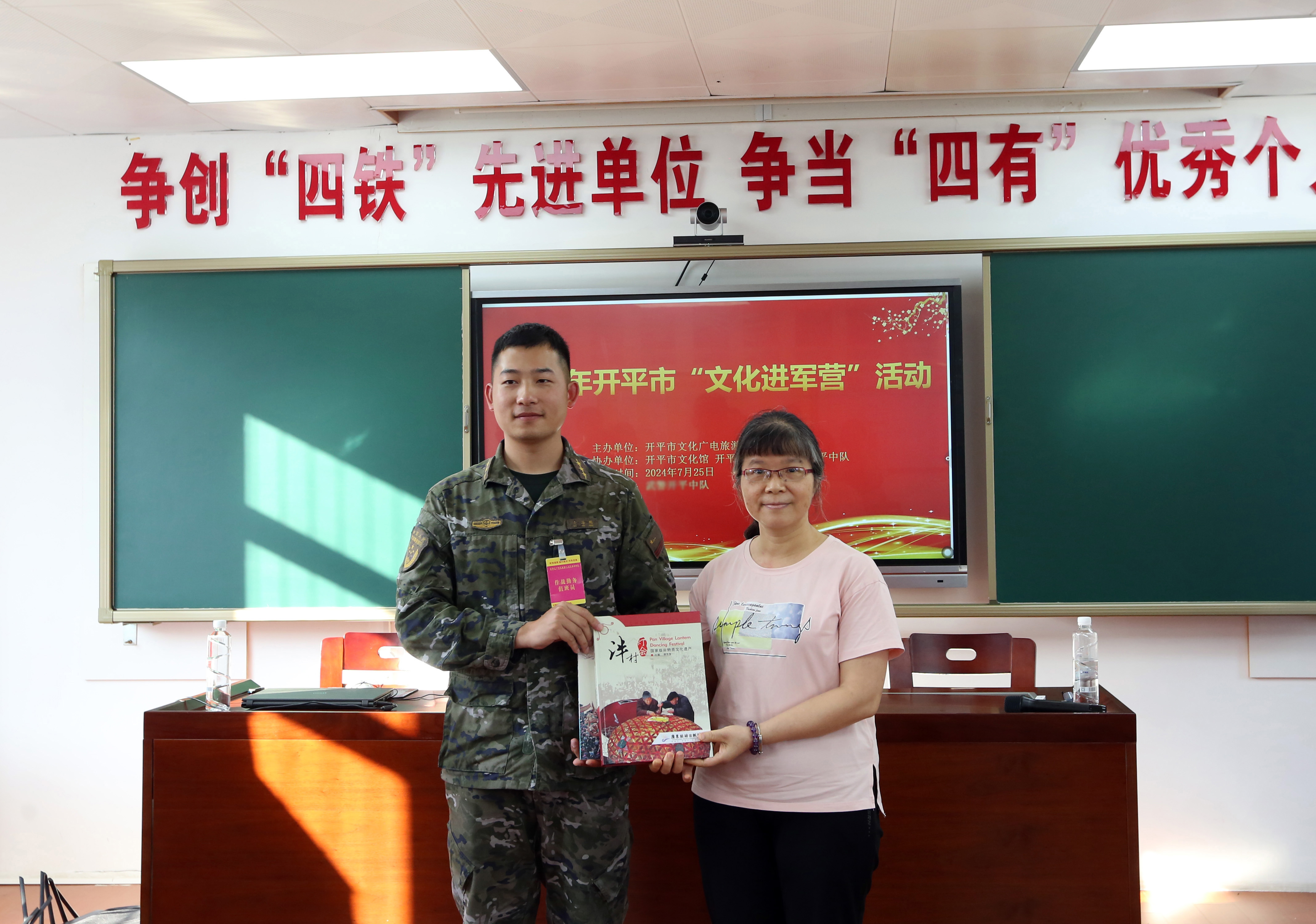 活動最后,主辦單位分別向駐軍部隊捐贈《泮村燈會》《開平市非物質(zhì)文化遺產(chǎn)名錄》等非遺書籍、書法作品、美術作品集。
