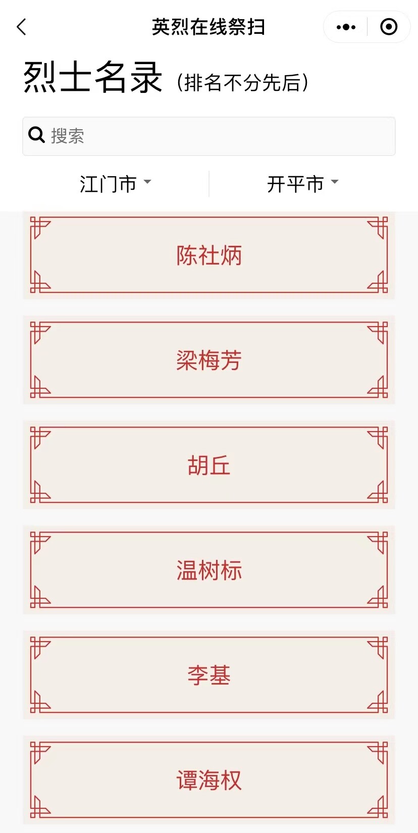 3.點(diǎn)擊進(jìn)入英烈在線祭掃服務(wù)后,選擇所屬地域或全部地域,可見烈士名錄,也可以搜索烈士英名查詢。