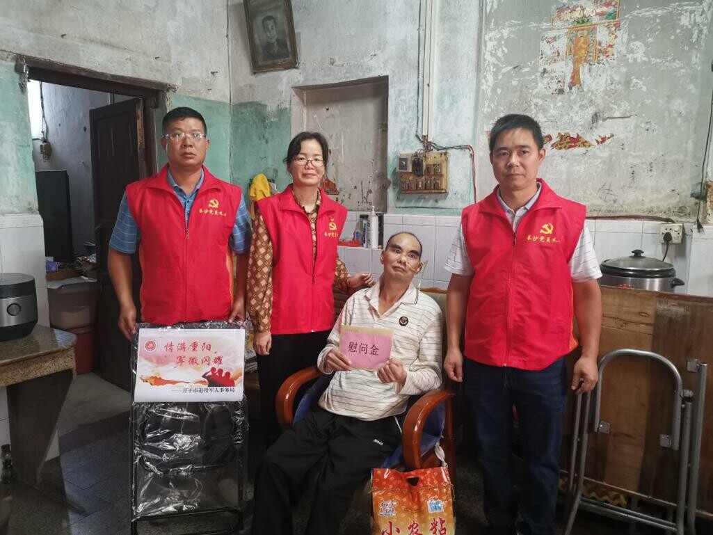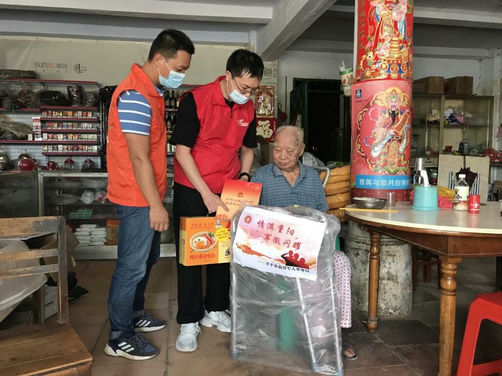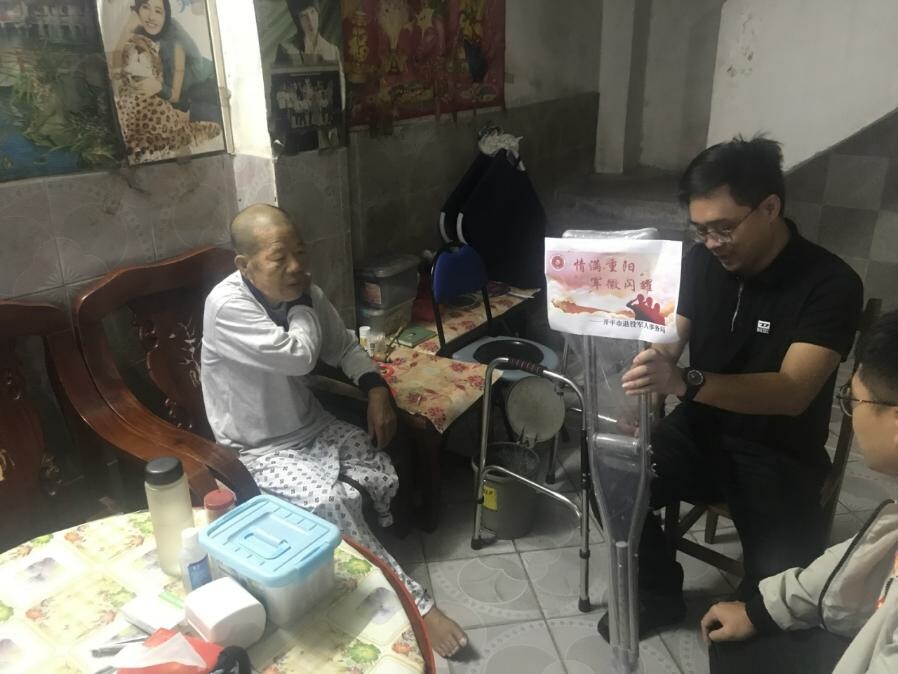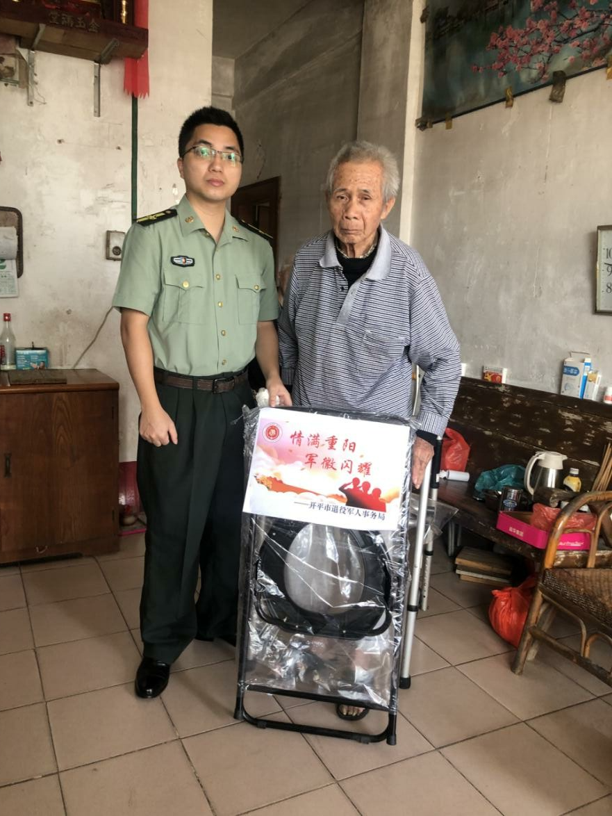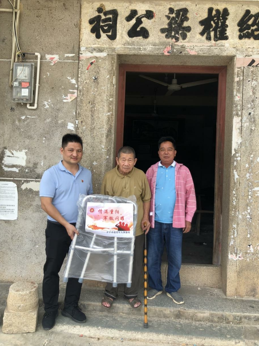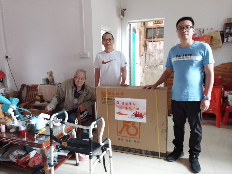 金秋十月,秋高氣爽。在重陽節(jié)來臨之際,為深入開展常態(tài)化聯(lián)系退役軍人工作,不斷豐富志愿者服務(wù)內(nèi)容,弘揚中華民族敬老,愛老的優(yōu)良傳統(tǒng)。10月11日起,開平市退役軍人事務(wù)局和志愿服務(wù)隊帶著對年老退役軍人及重點優(yōu)撫對象的關(guān)心關(guān)愛之情,多方爭取,統(tǒng)籌調(diào)配了輪椅、醫(yī)用拐杖、助行器等一批物資,開展了“情滿重陽,軍徽閃耀”贈醫(yī)贈藥活動。