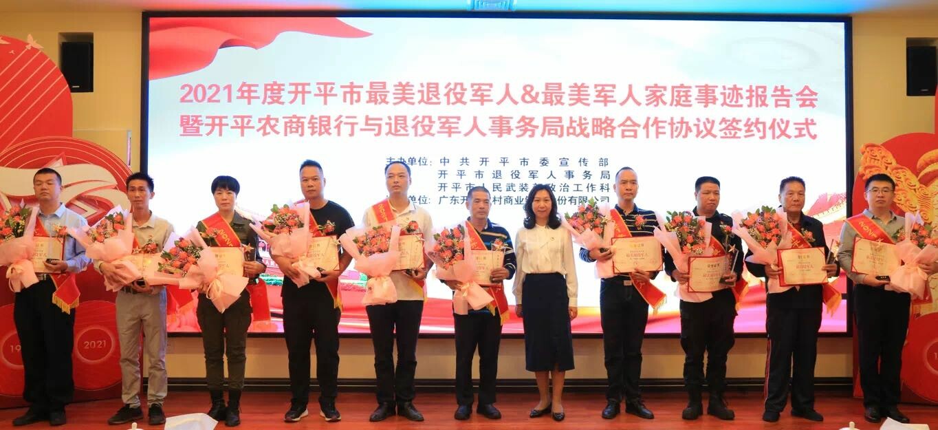 10月28日上午,2021年度開平市“最美退役軍人”“最美軍人家庭”事跡報告會暨市退役軍人事務(wù)局與開平農(nóng)商銀行戰(zhàn)略合作協(xié)議簽約儀式在周文雍陳鐵軍烈士紀(jì)念館舉行。通過表彰活動大力弘揚(yáng)“民擁軍”“軍愛民”光榮傳統(tǒng),在全社會營造關(guān)心國防、尊崇軍人、向模范人物看齊的濃厚氛圍。