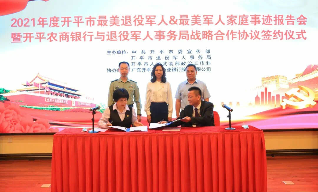 報告會結(jié)束后,還舉行了開平市退役軍人事務(wù)局與開平農(nóng)商銀行股份有限公司戰(zhàn)略合作協(xié)議簽約儀式。在2019年,開平農(nóng)商銀行就推出“擁軍優(yōu)撫卡”,今年繼續(xù)推出“擁軍e存”定期存款、擁軍貸等專屬優(yōu)惠,進(jìn)一步發(fā)揮金融系統(tǒng)在擁軍和優(yōu)撫事業(yè)中的特有作用。這也是市退役軍人事務(wù)局做實做好“我為退役軍人辦實事”實踐活動,切實增強(qiáng)廣大退役軍人的獲得感、幸福感、榮譽(yù)感的重要舉措。