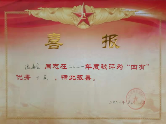 溫嘉寶同志在2020、2021年連續(xù)榮獲部隊(duì)“四有”優(yōu)秀士兵稱號(hào),充分體現(xiàn)軍人的忠誠(chéng)擔(dān)當(dāng)和無(wú)私奉獻(xiàn)。喜報(bào)不僅送進(jìn)軍人家庭的門,更送進(jìn)了軍人家屬的心。服務(wù)站工作人員與家屬親切交談,告知他們溫嘉寶同志在部隊(duì)表現(xiàn)優(yōu)秀,榮獲“四有”優(yōu)秀士兵稱號(hào)。工作人員詳細(xì)了解軍人家庭的生活情況,鼓勵(lì)軍屬支持軍人安心服役,再立新功。家屬表示感謝黨和政府的關(guān)心厚愛,一定全力支持軍人的工作,繼續(xù)做堅(jiān)強(qiáng)后盾。