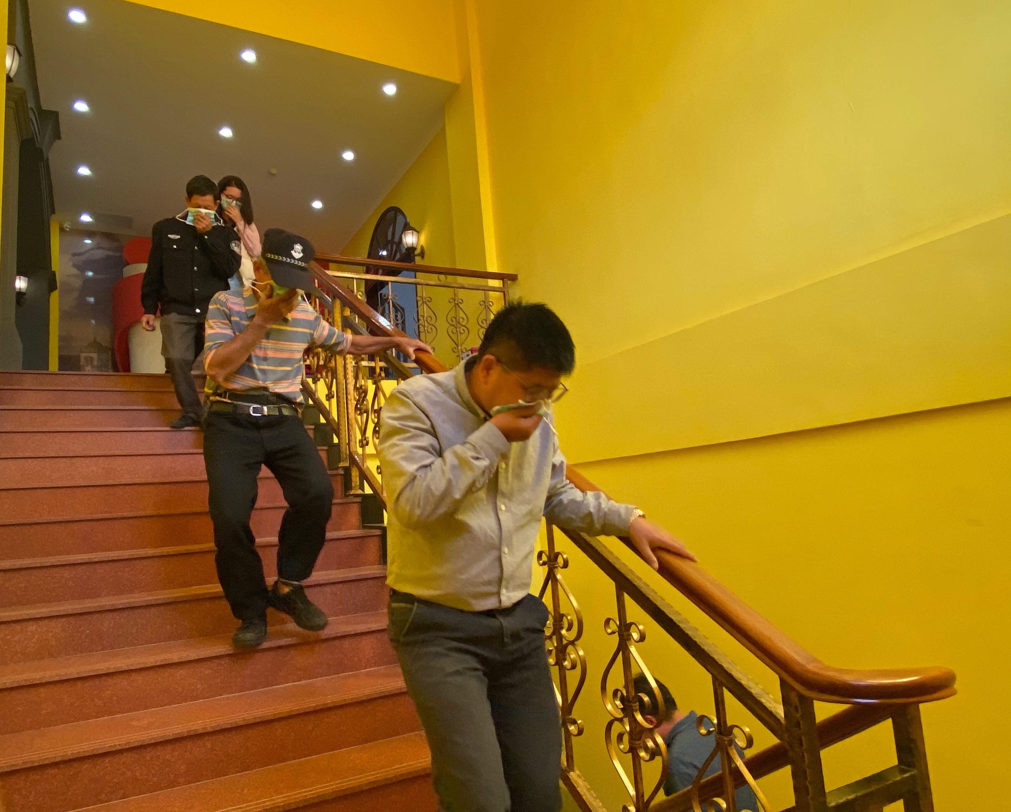 接著進(jìn)行的是疏散逃生應(yīng)急演練。演練假設(shè)展廳區(qū)域內(nèi)發(fā)生火災(zāi),在發(fā)現(xiàn)警情后,疏散組人員組織現(xiàn)場(chǎng)所有人員用手捂口鼻有序向展廳外安全地帶逃生,同時(shí)現(xiàn)場(chǎng)滅火組保安迅速到達(dá)著火區(qū)域,對(duì)火勢(shì)進(jìn)行控制,整個(gè)疏散演練過(guò)程撤離井然有序,達(dá)到了預(yù)期效果。