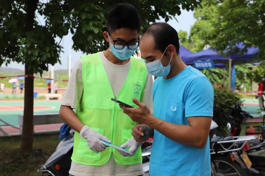 李曉東是開平市2022年第一批光榮返鄉(xiāng)的退役軍人,其母親張珠蘭是蒼城鎮(zhèn)公服中心的職員,在接到開展預警式核酸篩查消息后,她第一時間取消休假,立即返崗,投身到潭碧村采樣點的抗疫工作中。李曉東在母親的先鋒精神帶動下,主動奔赴采樣任務最重的文體廣場支援。預入口處,李曉東頂著33℃的烈日耐心地指引群眾使用手機生成核酸碼,維護現場秩序。