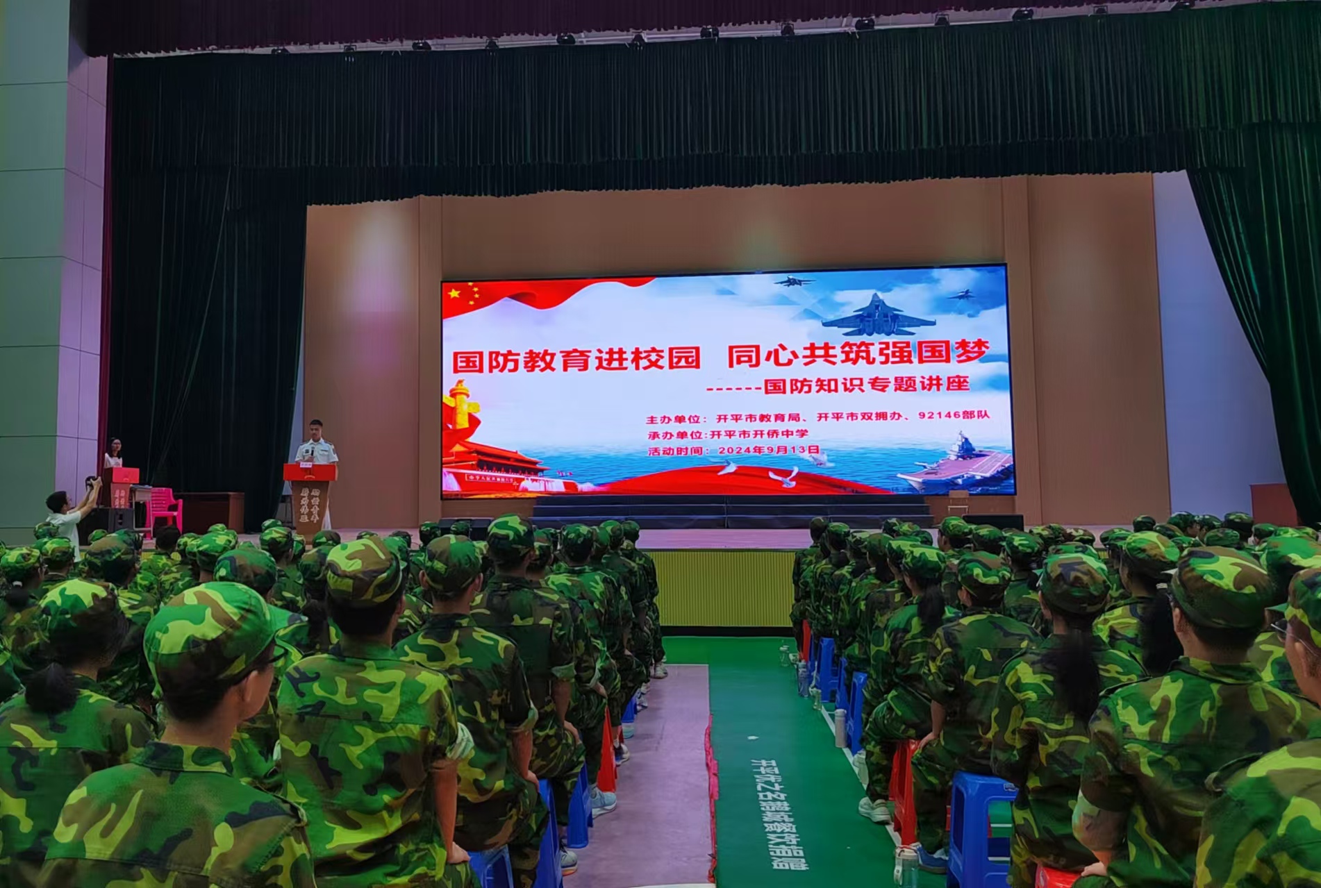 開平市新生軍訓(xùn)于9月9日拉開帷幕。為加強(qiáng)國防教育,激發(fā)學(xué)生愛國熱情,9月13日,由開平市雙擁辦、開平市教育局、駐開某部隊(duì)聯(lián)合主辦的“國防教育進(jìn)校園”國防知識講座在開僑中學(xué)舉行。部隊(duì)代表以《中國夢 強(qiáng)軍夢--強(qiáng)國必須強(qiáng)軍》為題開展國防教育講座,吸引了開僑中學(xué)高一全體軍訓(xùn)新生、部分教職工等近900人參加。