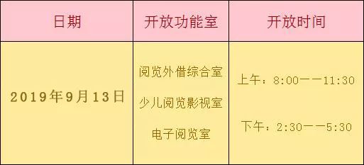 9月13日晚上18:00—21:00暫停開(kāi)放。如有不便,敬請(qǐng)諒解!開(kāi)平市圖書(shū)館2019年9月12日
