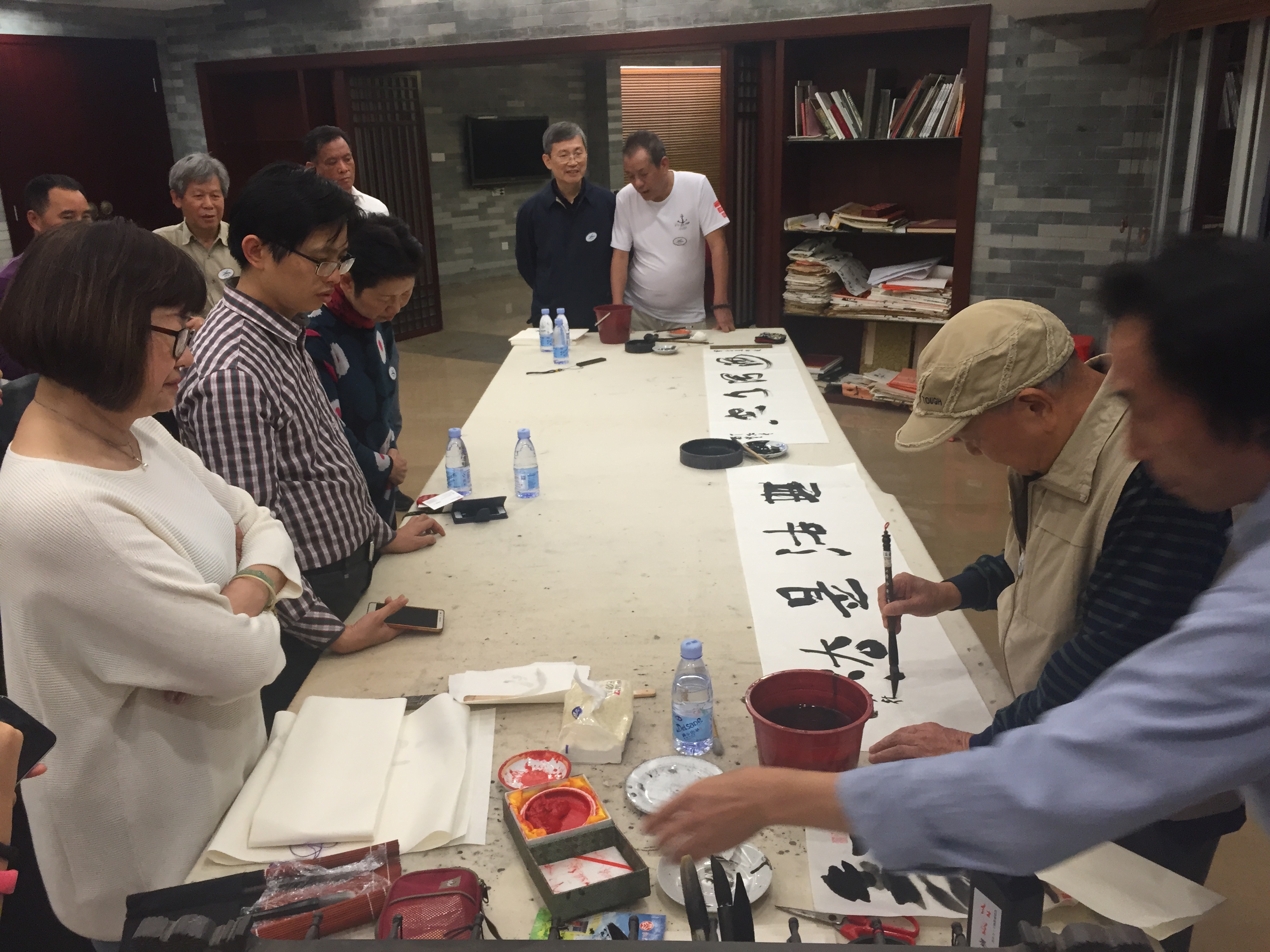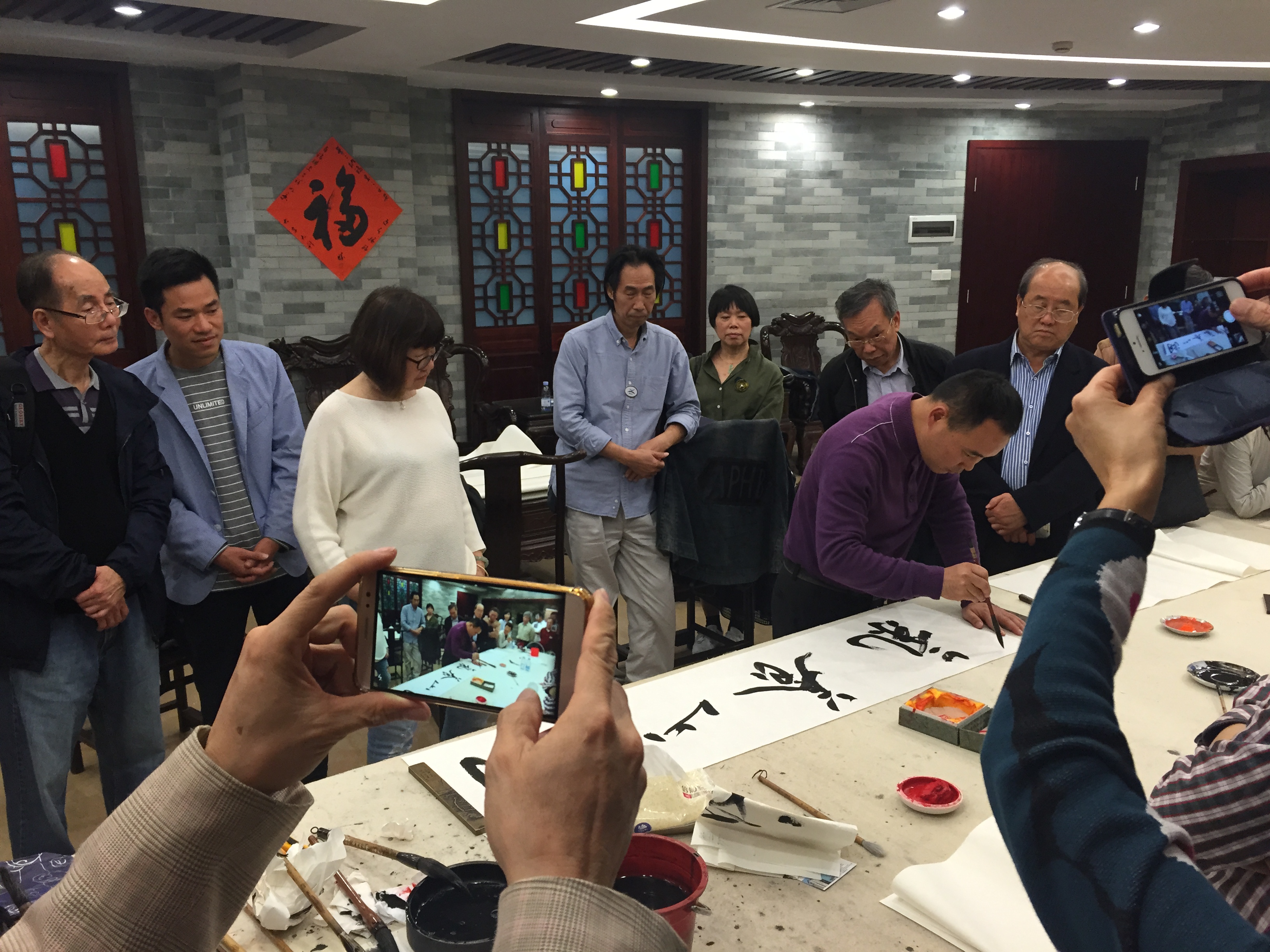 11月28日,香港中聯(lián)辦宣傳文體部組織中國書法家協(xié)會香港分會會員一行25人組成“大灣區(qū)文化行”參訪團到開平市參訪交流。參訪團一行首先參觀了開平市文化館和開平市非物質(zhì)文化遺產(chǎn)展示館,然后到世界文化遺產(chǎn)——自力村碉樓群和立園景區(qū)實地參觀和采風。開平市文廣新局副局長譚發(fā)寧陪同參訪。 晚上,參訪團書法家與開平書法家在譚逢敬藝術院舉行交流、筆會、雅集活動。兩地藝術家交流書法創(chuàng)作心得體會,氣氛熱烈融洽,活動收到良好的效果。江門市書法家協(xié)會主席、開平市文聯(lián)主席馮永勝,開平市美術館館長李強穩(wěn)等參加了雅集交流活動。 中國書法家協(xié)會香港分會交流合照 香港書法家交流 馮永勝現(xiàn)場揮毫交流